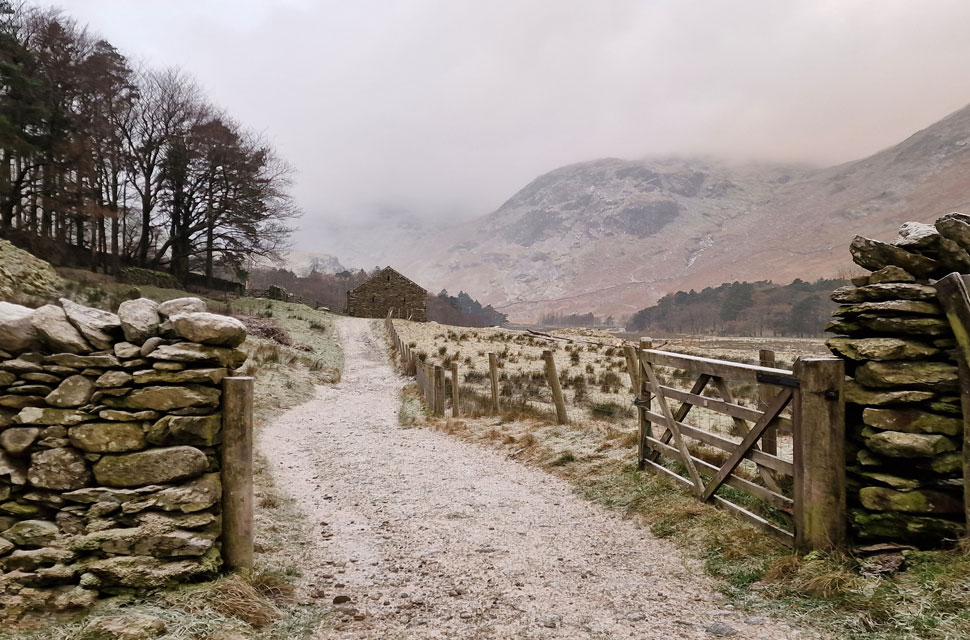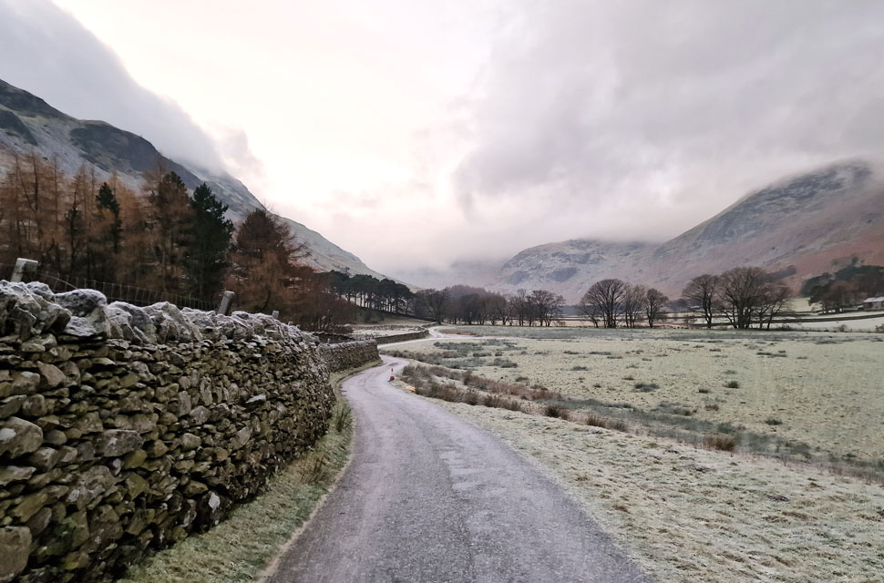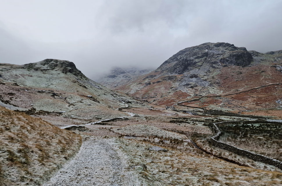 During the time it had taken me to kit up I'd not been passed by a car, resident, or walker, but I could hear voices from the George Starkey hut next door, where the owners or two camper vans chatted nearby. Kitted up, I locked my car and headed towards Grisedale Lane, almost opposite Patterdale Mountain Rescue. With Grisedale Lane reached, I passed the Cricket Ground, where half a dozen cars were parked. Most were frozen, looking like they'd been there all night, and I wondered about their occupants. Up ahead, the incline of the lane increases, while to my right, I could hear Grisedale Beck cascading through the trees below. I looked back and spotted no one as I reached the top of the lane, where I was treated to my first view of a frozen Grisedale Valley flanked by low clouds on both sides, which I was hoping would lift once Grisedale Tarn was reached. |