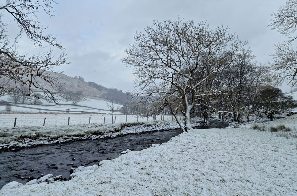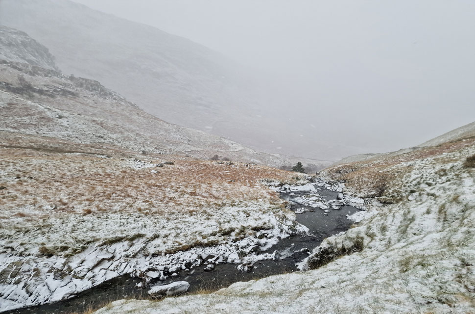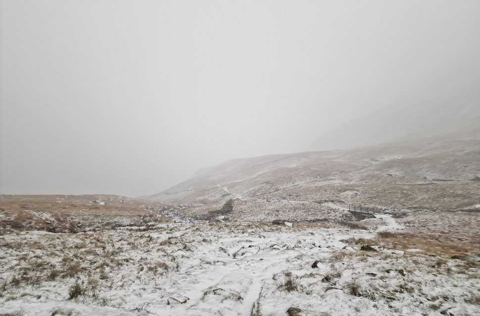 I continued into the valley, experiencing more snow flurries, some lasting longer, and noticed that the snow was beginning to stick. For the most part, the path was frozen with just the odd frozen puddle to skip over, but there were large sections of path that had fresh snow on top, disguising the frozen water below. Minutes earlier, I'd come a cropper on more than one occasion, managing to keep upright while winning gold in the 'how to keep upright olympics' but on the third occasion, after planting my right boot over fresh snow, my right leg buckled on the ice below, and I crashed to the ground in spectacular fashion, landing hard with a thud.