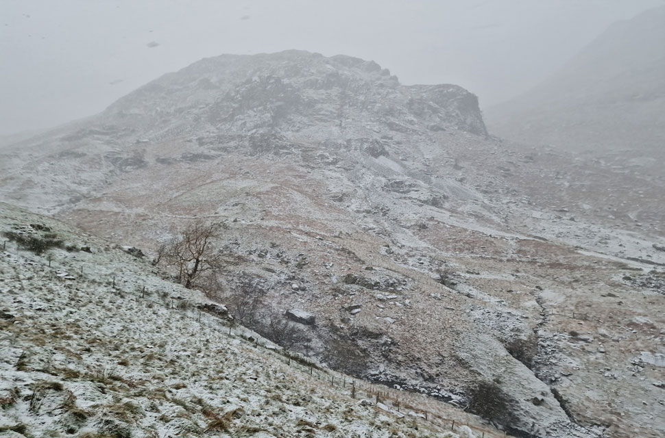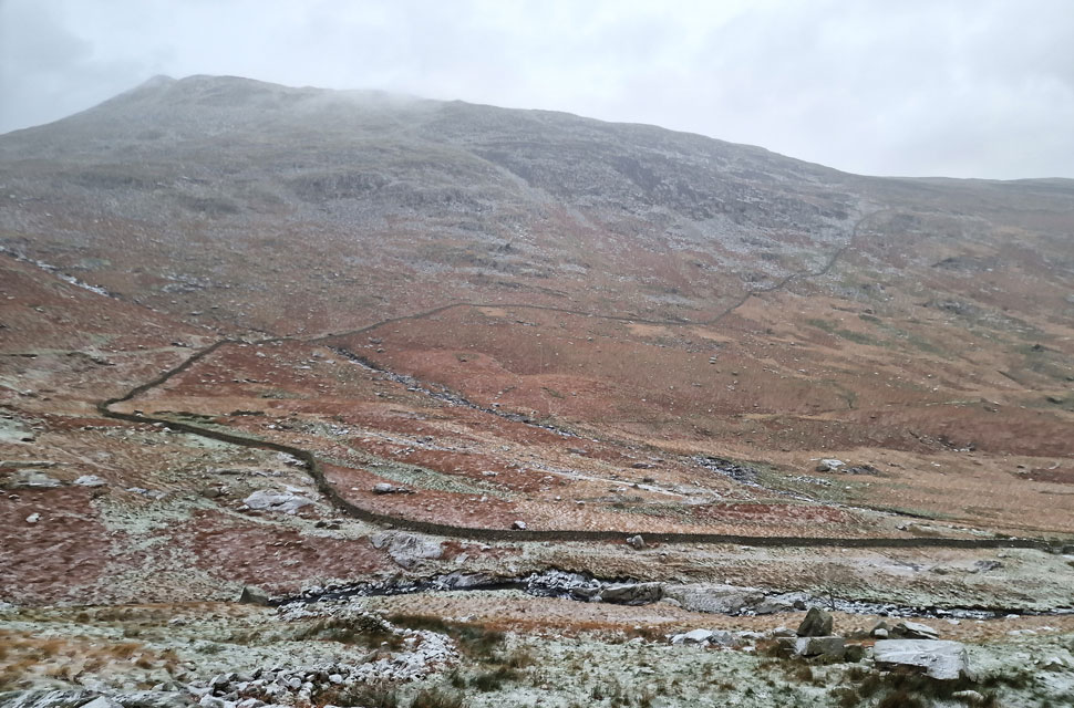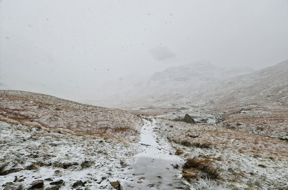 | After crossing Grisedale Beck at the footbridge I continued headfirst into the snow, the wind and hail was so strong I could no longer keep my head upright forcing me to look at the ground which isn't good when I was on ice watch. The path inclines and links up with the path on the opposite side of the valley and takes me away from my centralised position as I continue the climb towards Ruthwaite Lodge as the wind, snow and hail whip at my face. I am no longer enjoying this. |