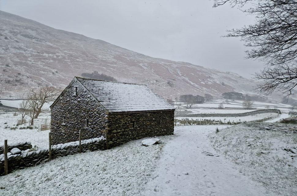 | Snow flurries came and went as I passed through Elm How Farm where my nostrils were treated to the smell of slurry and from the nearby sheds I could hear cattle rustling about. Up ahead is Cruck Barn where Alfred Wainwright spent the night on the Queens Coronation back in June 1953. |