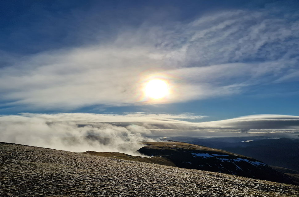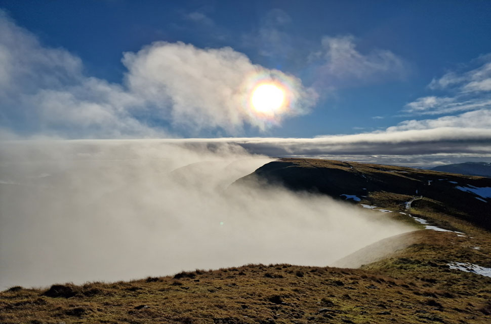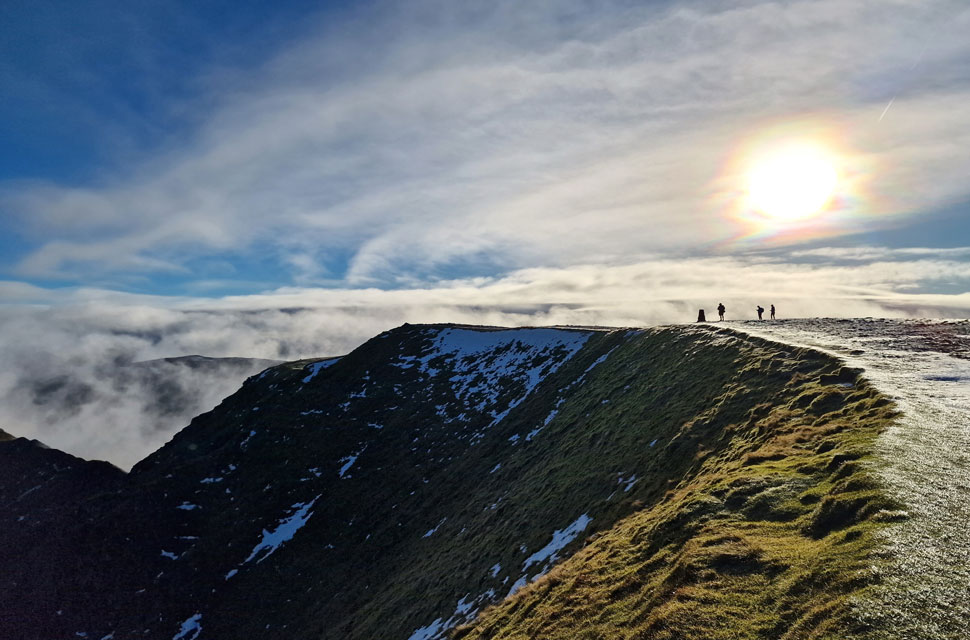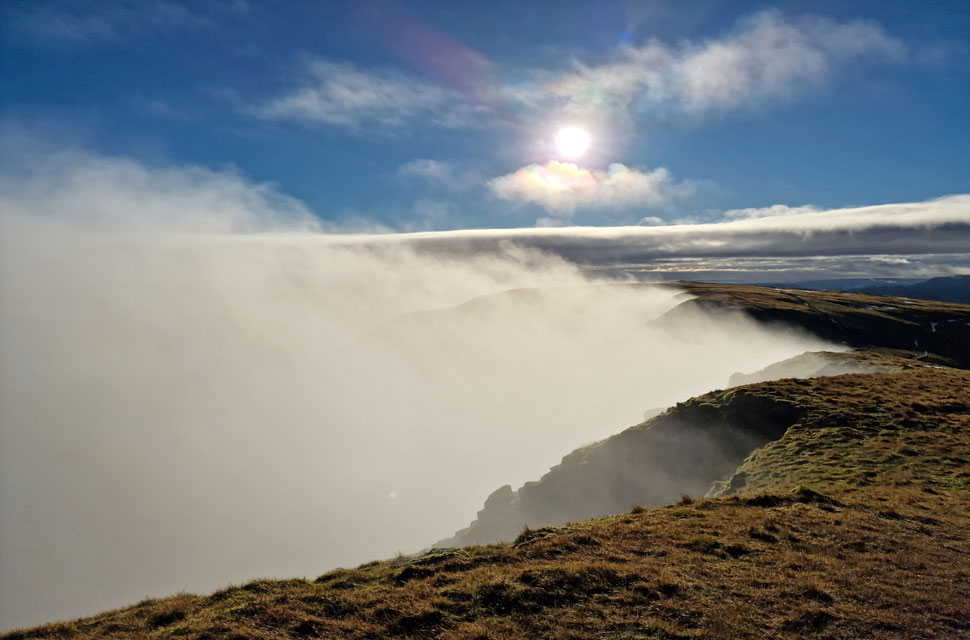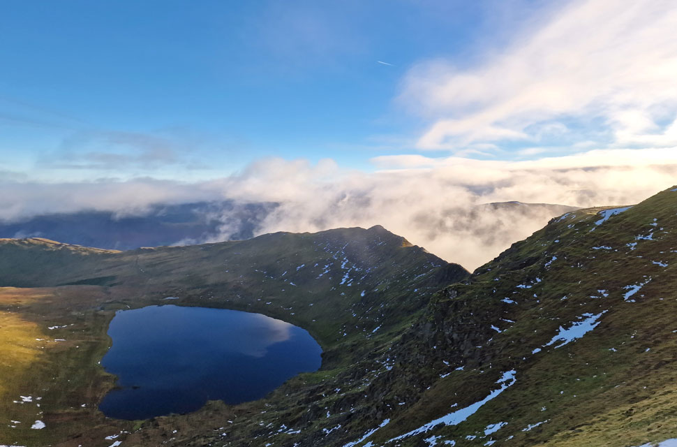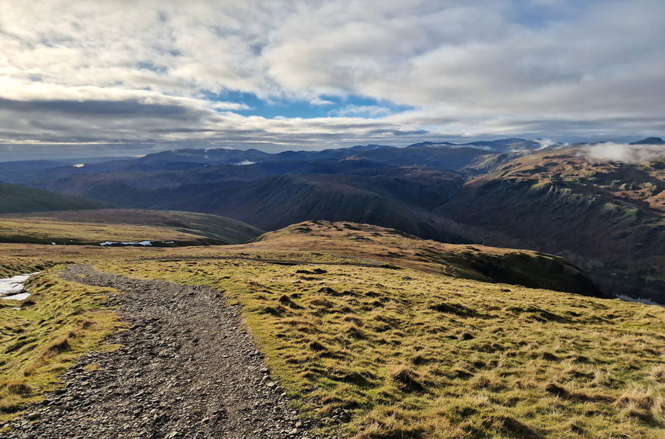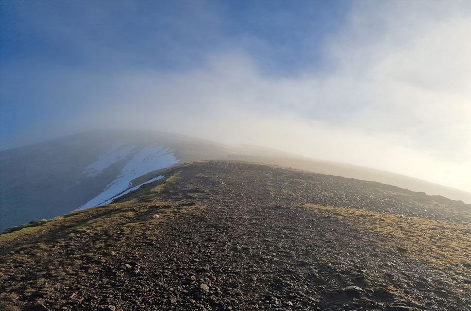 The sunlight was a blessing with summit temperatures lingering around freezing and with little to no wind it felt quite mild as I took in the views towards Lower Man wondering if I'll make its summit before the cloud arrives. |