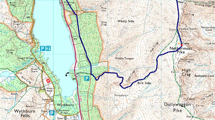 Swirls – Helvellyn Gill - Browncove Crags – Helvellyn Lower Man – Helvellyn – Nethermost Pike – Birk Side – Comb Crags – Wythburn - Forestry Track - High Park Wood - Swirls |