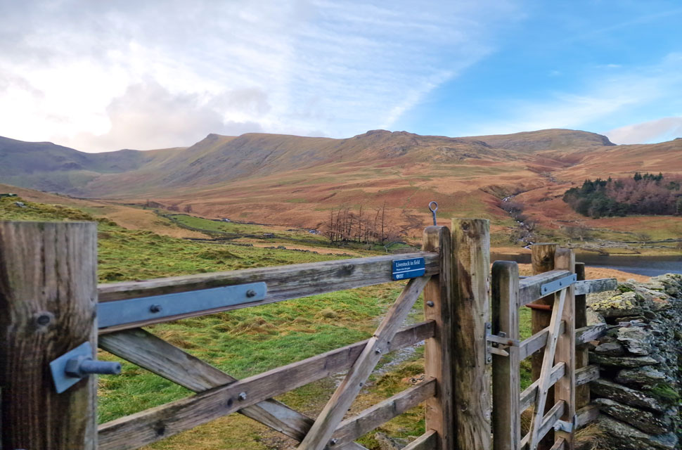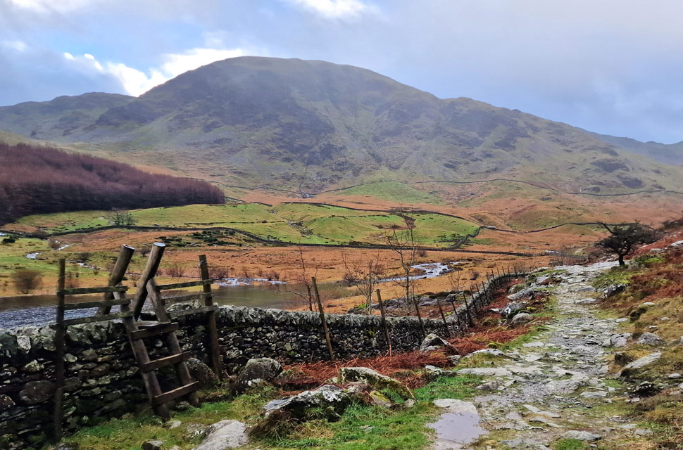 Testing footings became more common, but I was still able to maintain a good pace as my boots soaked up the flank of the fell until the gradient eased over more boot-swallowing bog. There was no way around the bog; each step was as boggy as the next, it was just a case of going for it. Bowderthwaite Bridge came next, where I stamped my soaked boots on the concrete foundations to rid them of tangled grass. It worked, and for measure, I rinsed them in the beck. Just two walkers ahead disappeared around the headland that forms The Rigg, and minutes later I joined them, where my view was filled with Harter Fell in the fading light and folk returning to their cars who, like me, had just enjoyed their first walk of 2024. |
