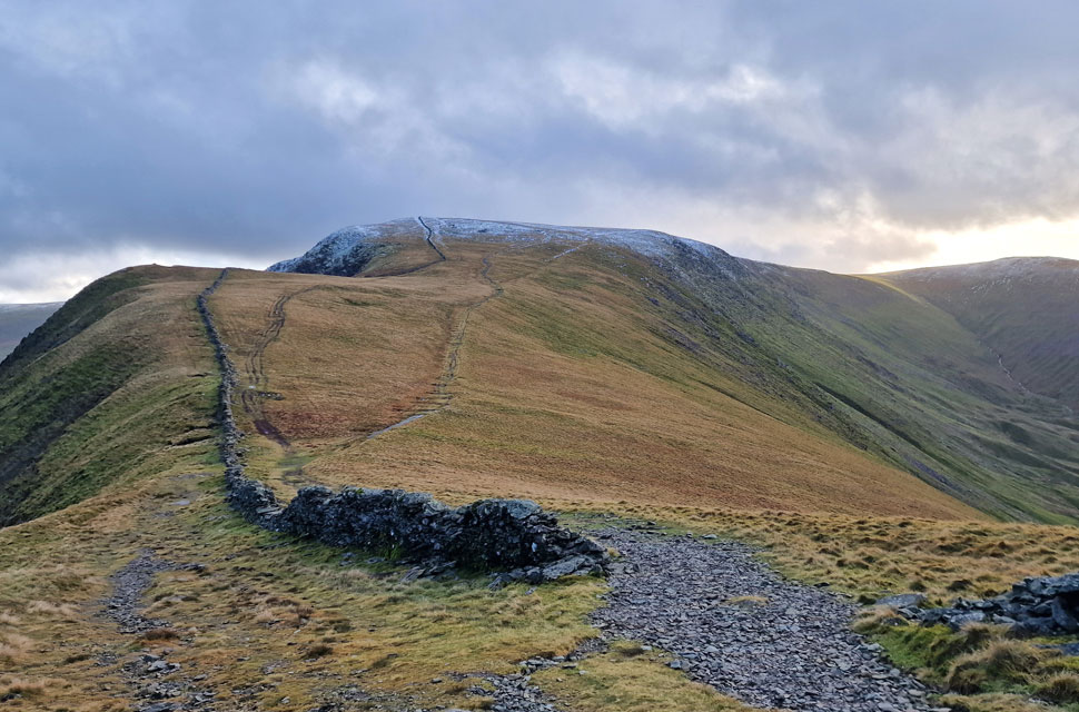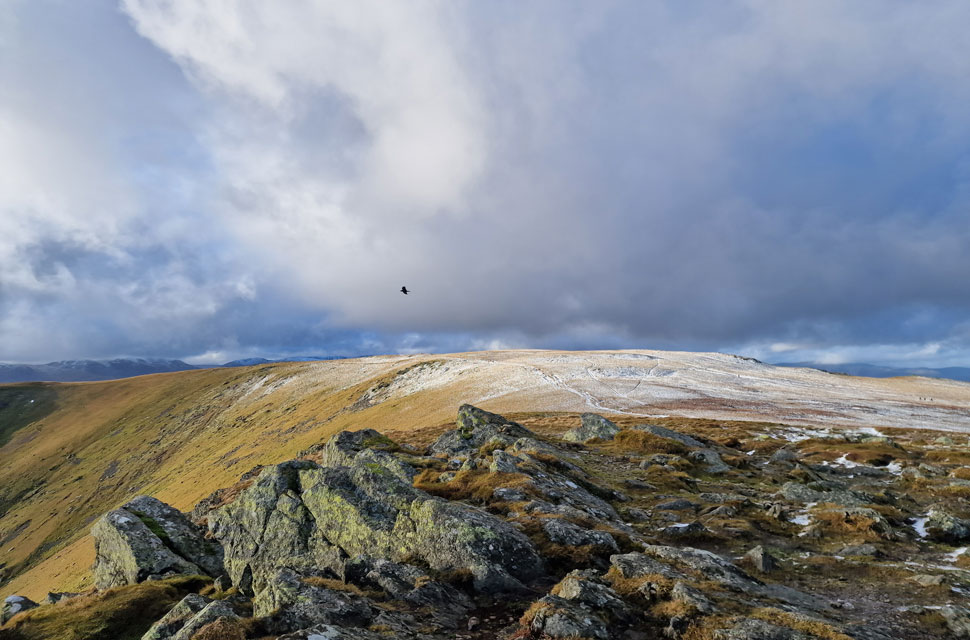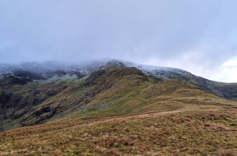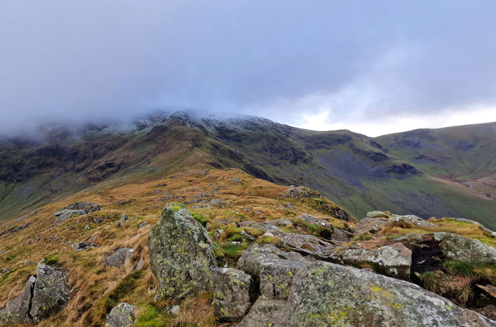 Long Stile and High Street seen beyond Rough Crag ahead. |