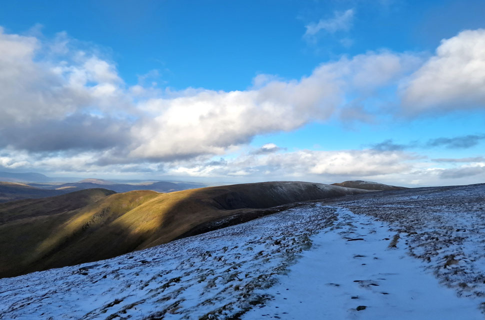 I joined the path and headed north over the Straights of Riggindale while sunlight dappled over the Knott and Rampsgill Head. It was cold now with the windchill snapping at my exposed fingers so I looped my mitts into action feeling the benefit instantaneously, the downside to wearing mitt'ed gloves is they don't pair well with the loops on my walking poles which I'd extended as far as they would allow. |