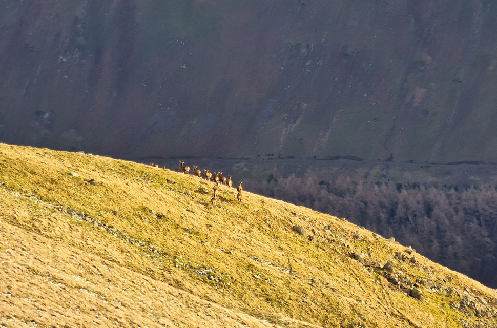 Here, you can see the pair of walkers re-joining the path. What happened next was totally magical. The two walkers, for now, maintained a good distance ahead until they dropped further onto the ridge ahead. Unbeknown to the pair, a herd of Deer were sprinting along the right shoulder of the fell side right below the couple, who were totally oblivious to it all, when, with no reason, the Deer doubled back, ascended the ridge, and crossed the path from right to left just feet in front of the couple. Even from my distance, I could see the couple were totally shocked by this, as was I. What had caused the Deer to double back and cross the ridge?