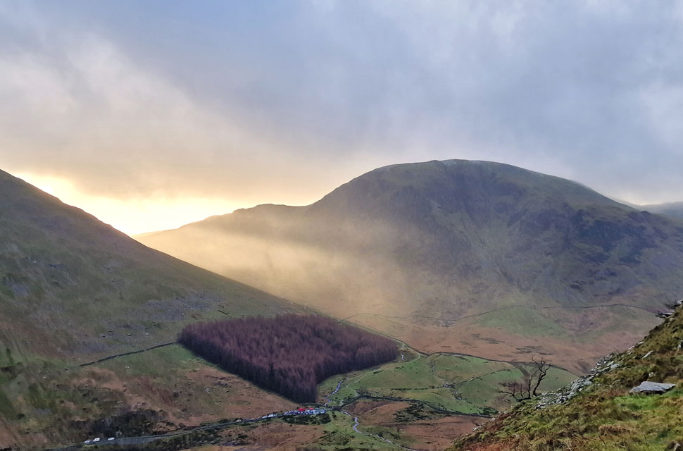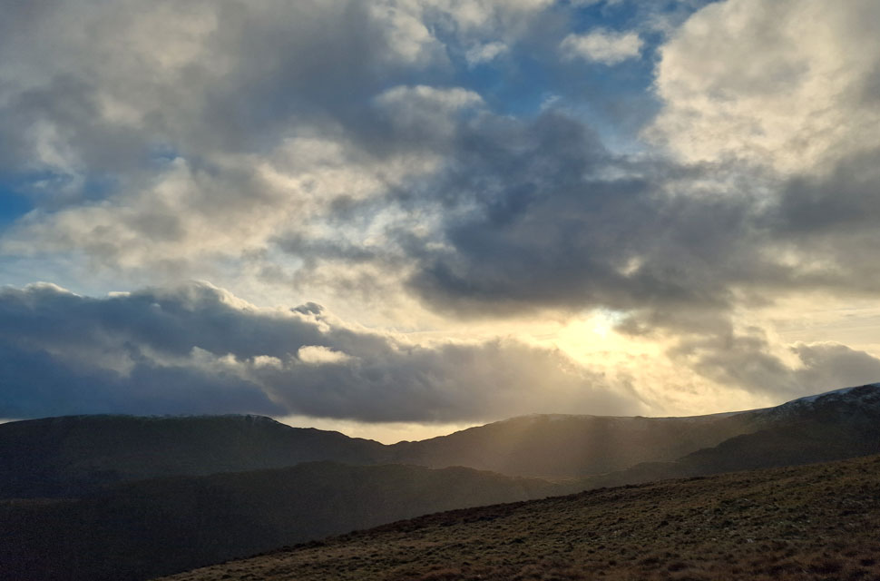 Shafts of light emerge from the top of Gatescarth Pass. |