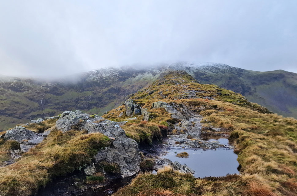 No sooner had I thought about removing my over-trousers did it begin to rain again, this time heavier, but thankfully, it didn't last. With Swine Crag and Heron Crag behind me, I was able to get a good look at the ridge ahead, where I found a solo walker at the base of Eagle Crag. The walker was just standing there, and for a few seconds I started to get a bit worried, but the closer I got, the more I realised he was looking at a GPS that he had strapped to his left wrist.
