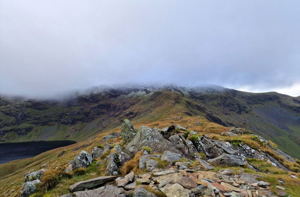I soon reached Rough Crag in between more showers which left the ridge ahead looking menacing and bleak. The wind had whipped up now causing a notable drop in temperature while further along the ridge I spotted two walkers in ascent. I really do hope the cloud clears sometime soon. |