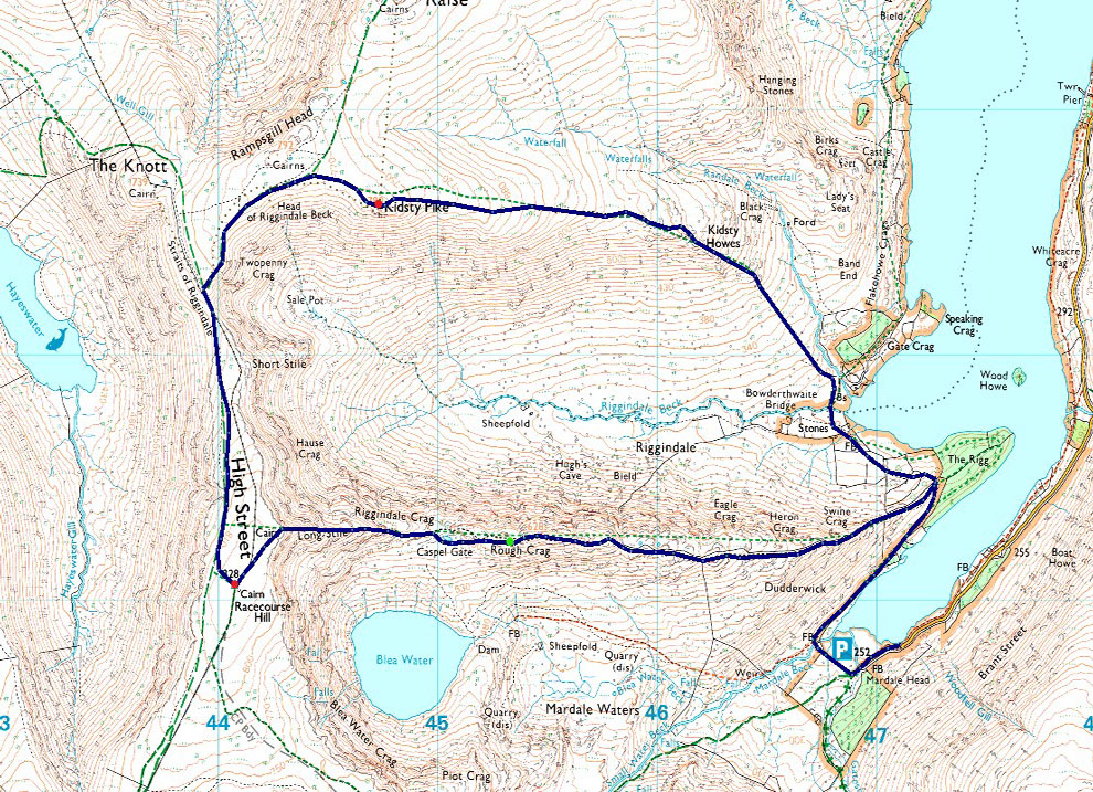 Mardale Head - The Rigg - Rough Crag - Caspel Gate - Long Stile - High Street - Straights of Riggindale - Two Penny Crag - Kidsty Pike - Kidsty Howes - Bowderthwaite Bridge - The Rigg - Mardale Head |