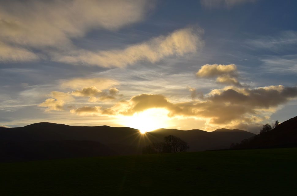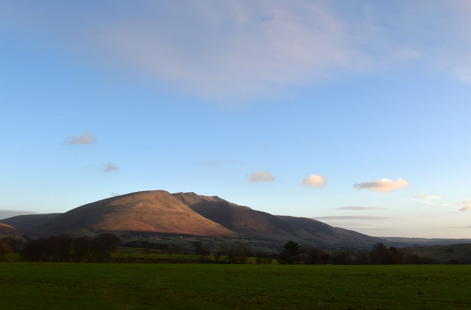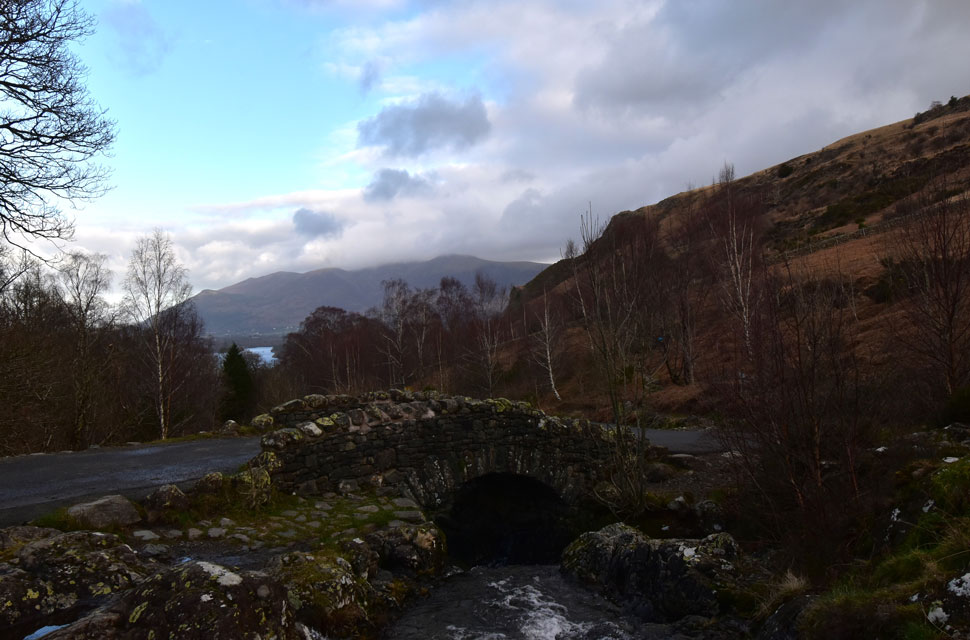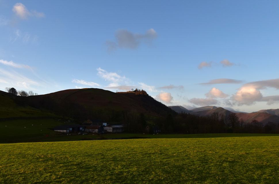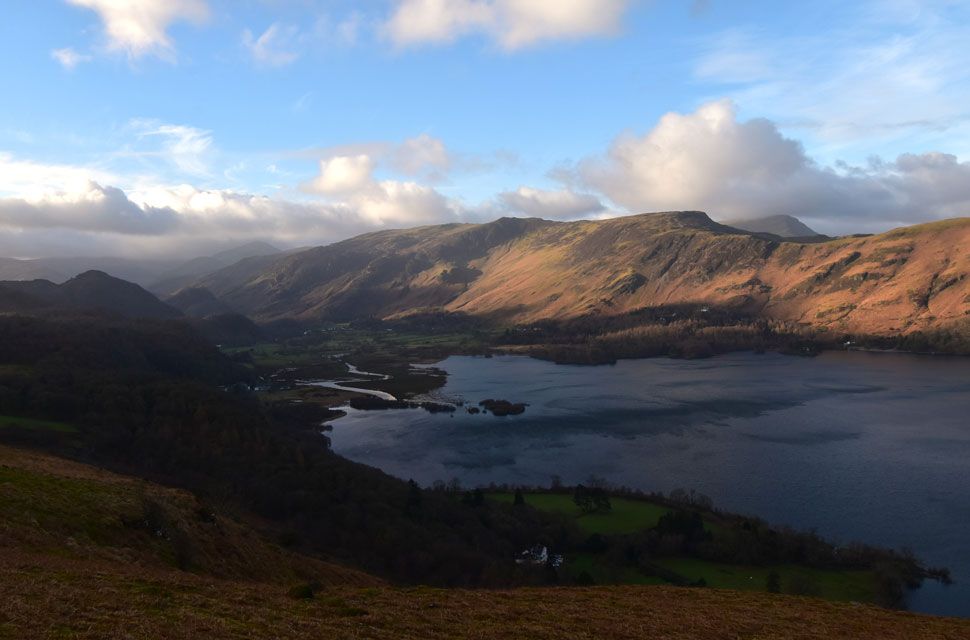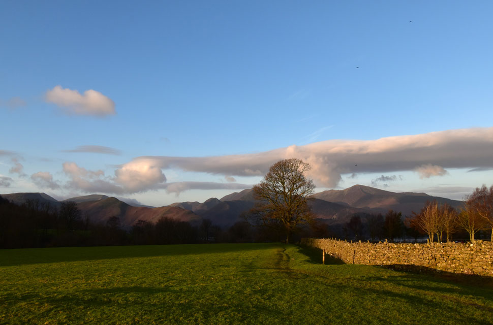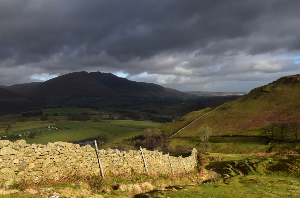 We flanked the summit and began our descent via the stone wall, and instead of crossing the footbridge, we waded through Brockle Beck, where we swilled our boots, knowing it was futile as the fields surrounding Rakefoot were just as muddy. That said, the sun stayed out for the duration of the walk, illuminating the Helvellyn ridge from north to south in winter sunshine, while further north, Blencathra looked like a scene from a Lord of the Rings movie. |
