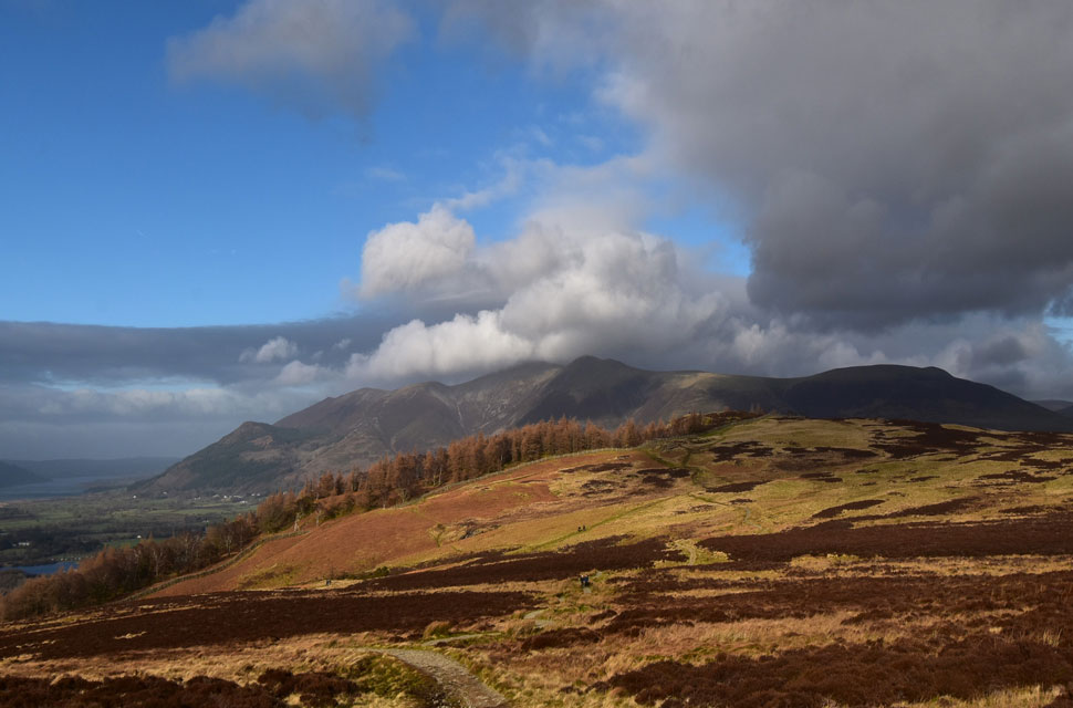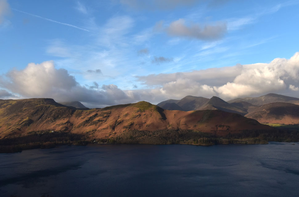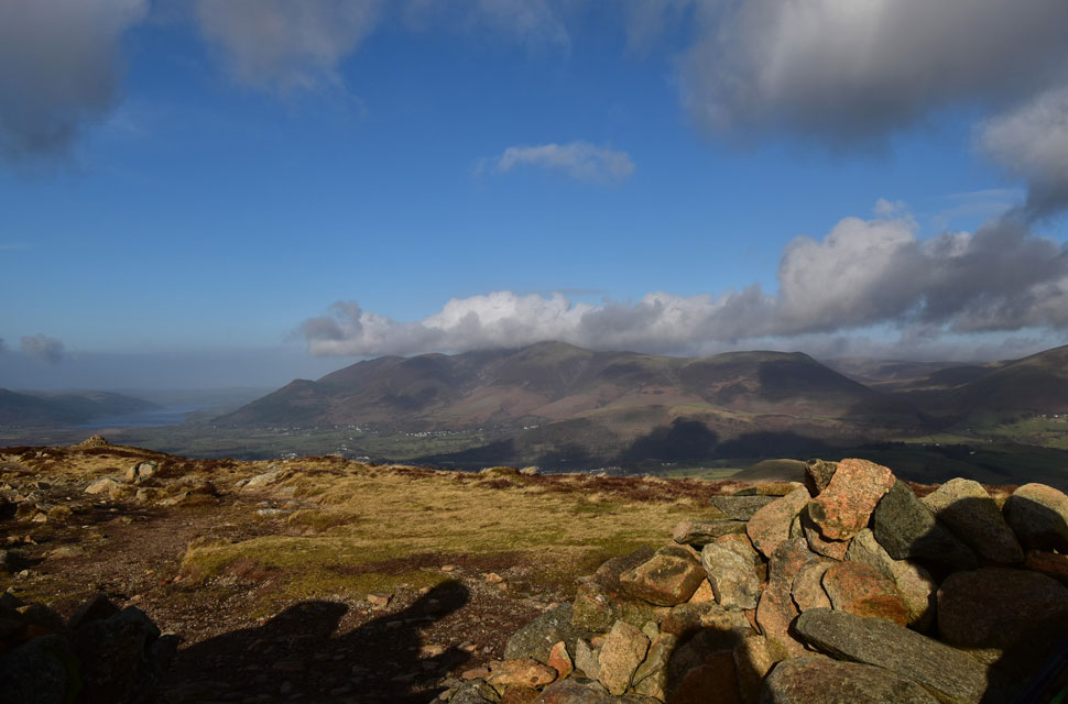 ...Cat Bells, Maiden Moor and Robinson dappled in sunlight with Causey Pike, Crag Fell (Eel Crag) Ard Crags, Knott Rigg, Grasmoor, Hopegill Head, Grisedale Pike, Outerside and finally Barrow over on the right. |