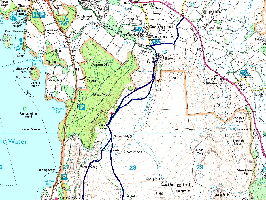 I threw in two suggestions: Cat Bells or Walla Crag, two summits that would keep us out of the high winds but still maintain medium-level height. Rod had walked Cat Bells at the beginning of January and came back with this route, or one very similar, as we changed it to include a quick visit to the Bob Graham Memorial Cairn just down from Ashness Bridge.