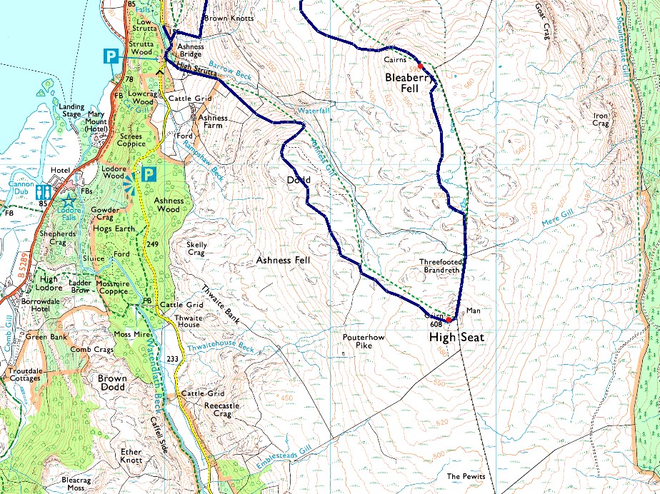 Nest Brow - Rake Foot - Walla Crag - Top of Cat Gill - Traverse Below Brown Knotts - Ashness Bridge - High Strutta - Ashness Gill - Dodd - High Seat - Threefooted Brandreth - Bleaberry Fell - Low Moss - Walla Crag - Rake Foot - Nest Brow |