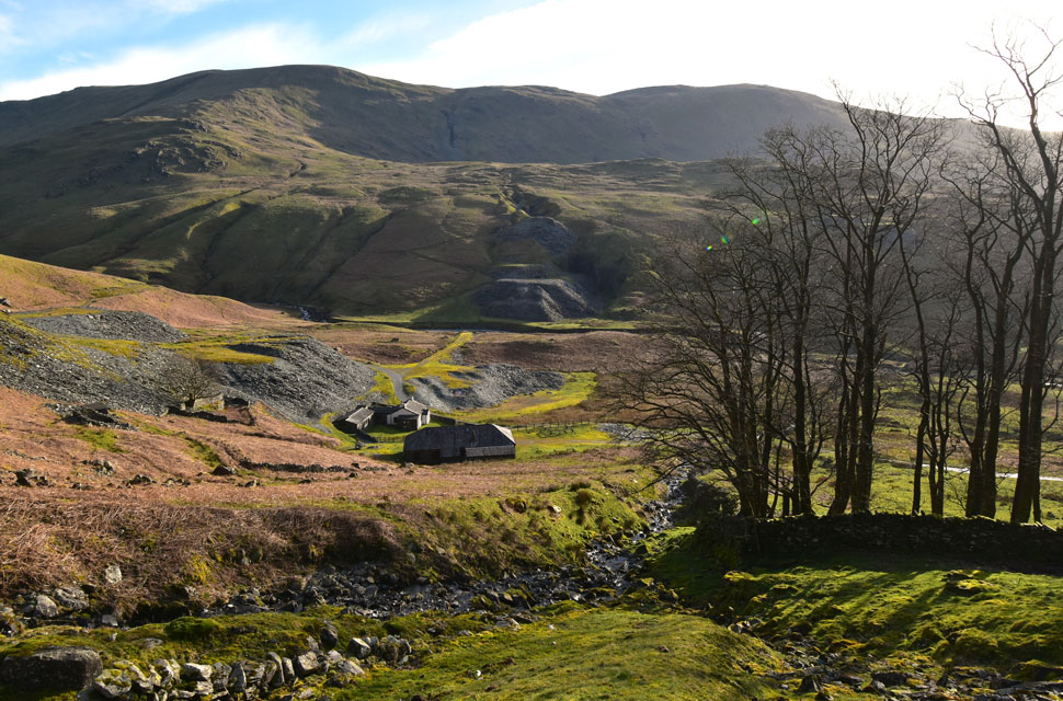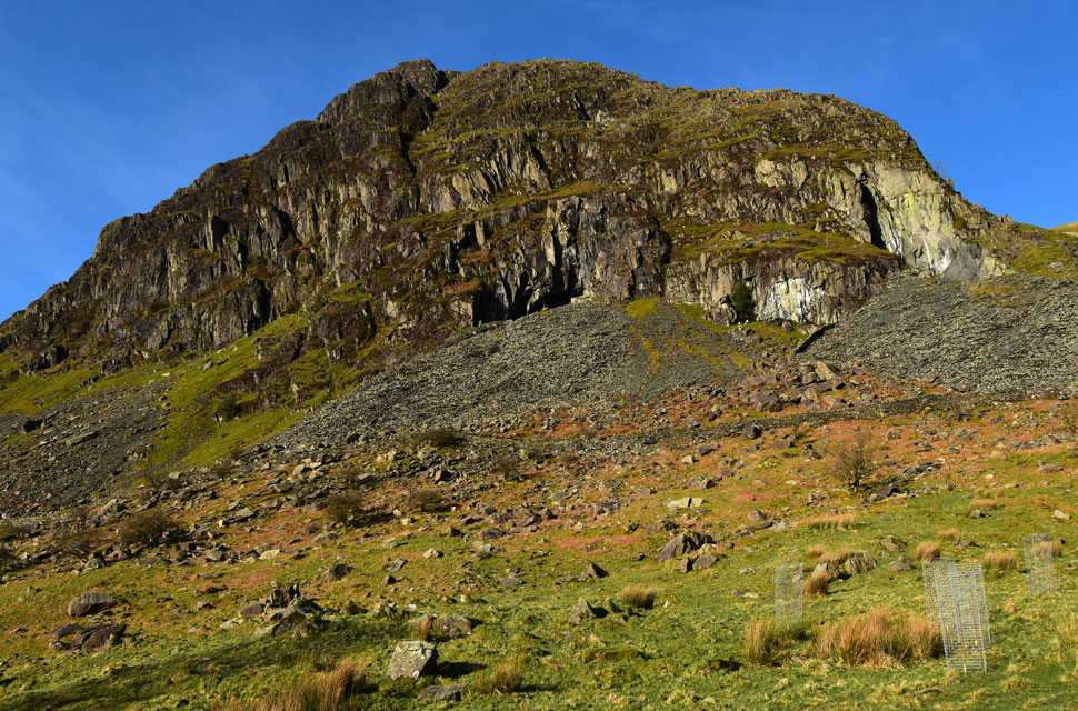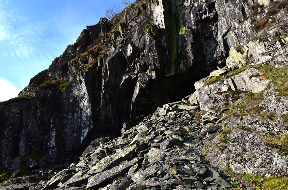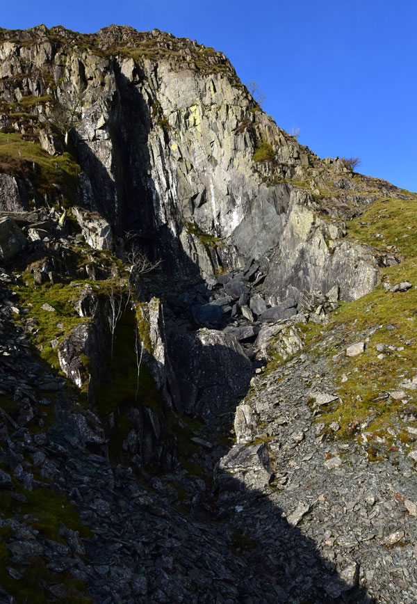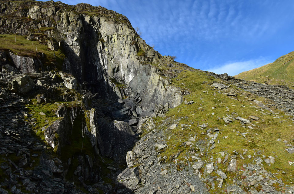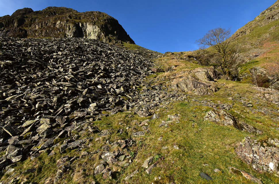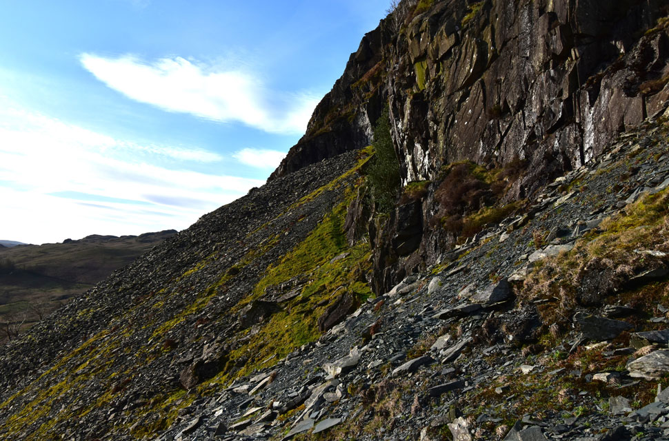 Crossing the slate spoil to reach Cauldron Quarry. |
