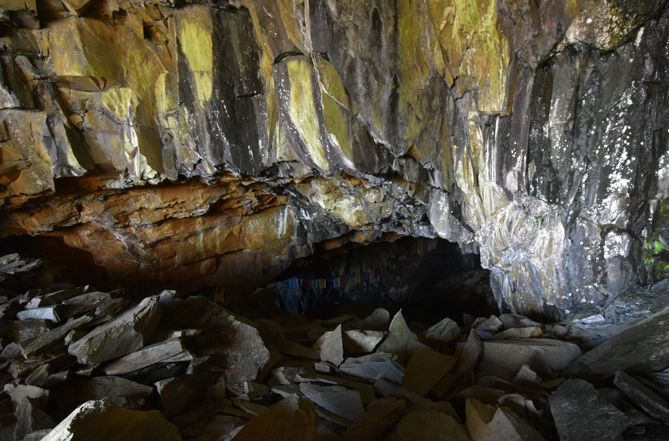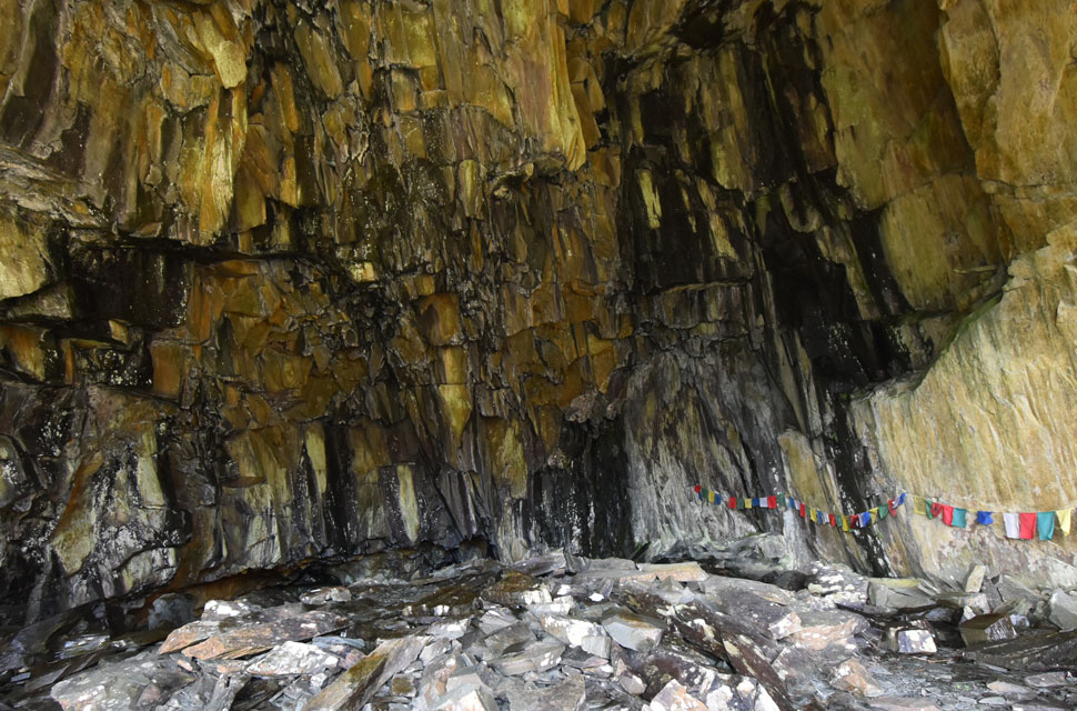 On reaching the entrance I was presented with amazing views into the cavern which had two chambers seen lower left where more Nepalese prayer flags can be found just like the one on the cavern wall. |