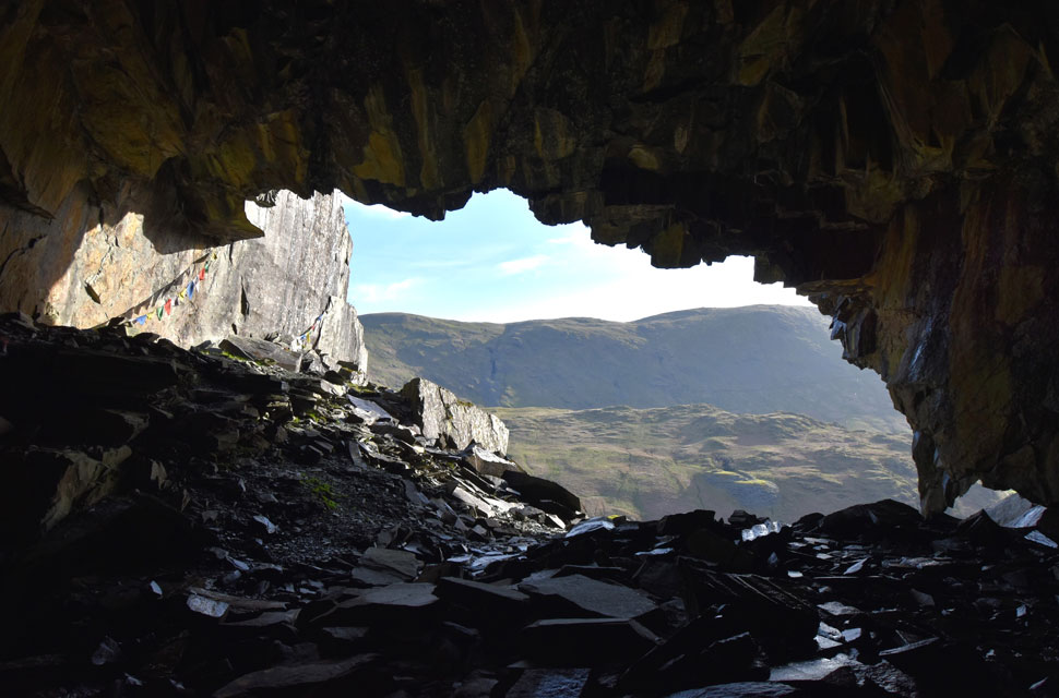 it was a bit of an exercise to get over the stone wall which was around chest height but luckily the stone waller had left a couple of protruding stones more so on the Lambfold side. Once over the wall the path climbs above the spoil to the mouth of the cavern which I ascend via a narrow path through the slate. |