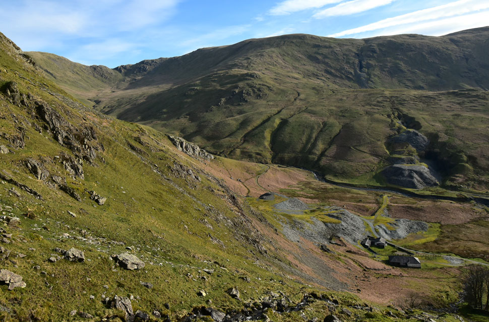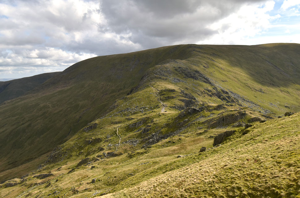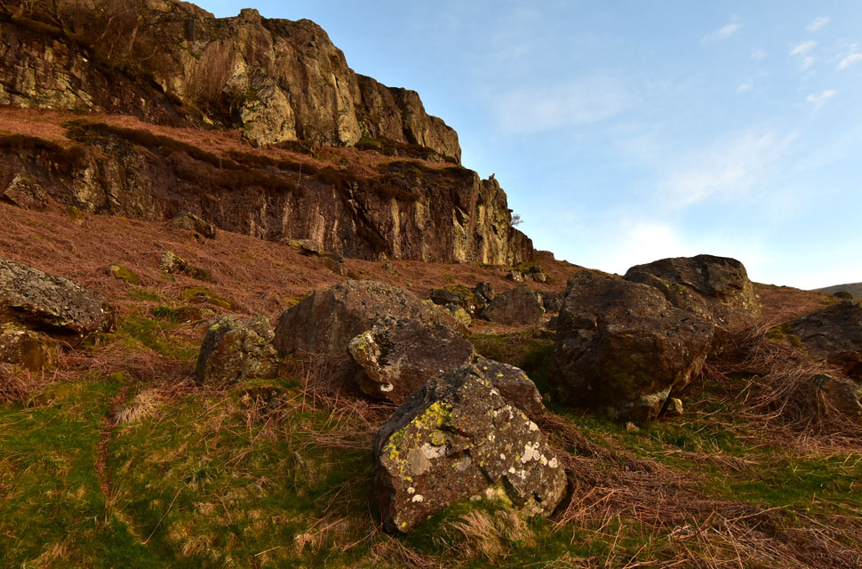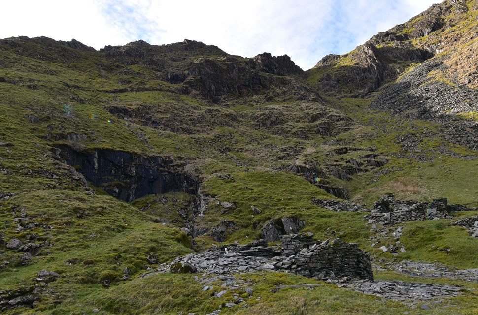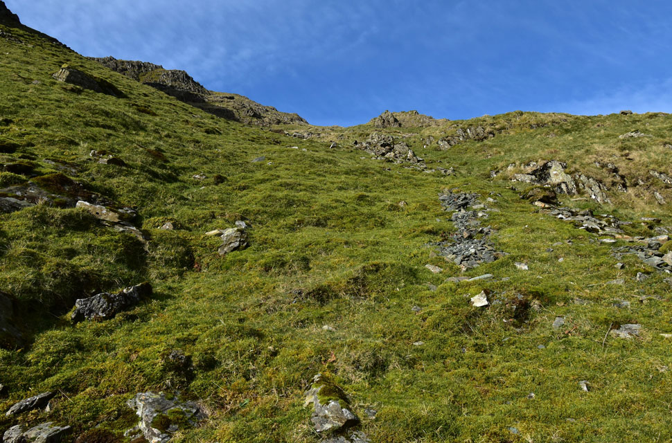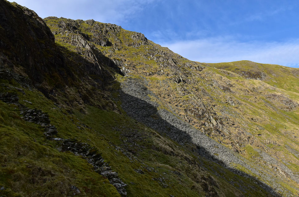 It was a brutally steep ascent into the cove where I found old miners huts and quarried fell side. From the base of the cove the Edge can be gained via the left which in hindsight, I wished I'd taken but instead I opted to ascend by the quarry seen left before continuing to the lowest point on the Edge. Alternatively the grass rake on the other side of the cove can be ascended which will totally by-pass ascent via the Edge. |