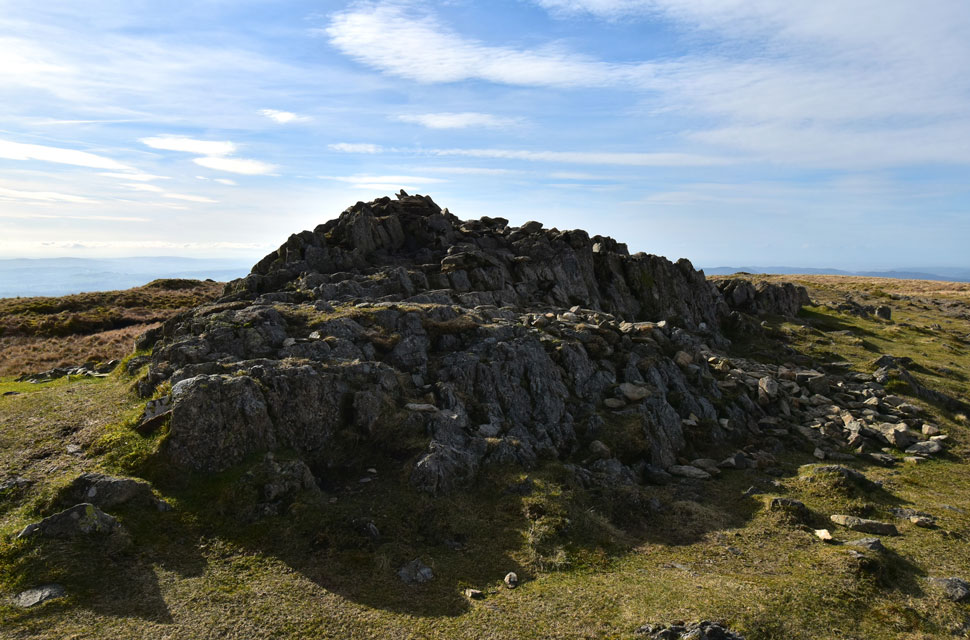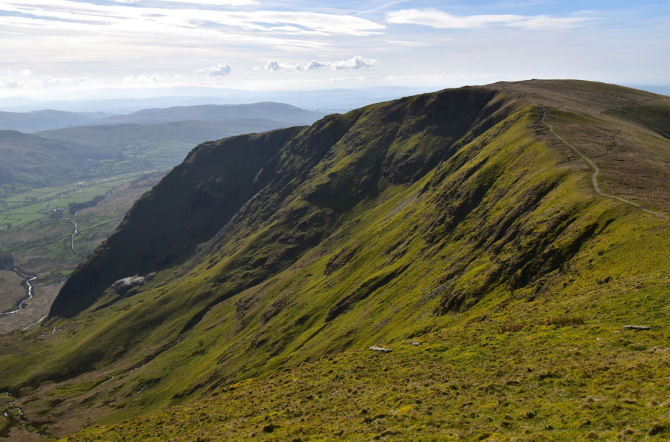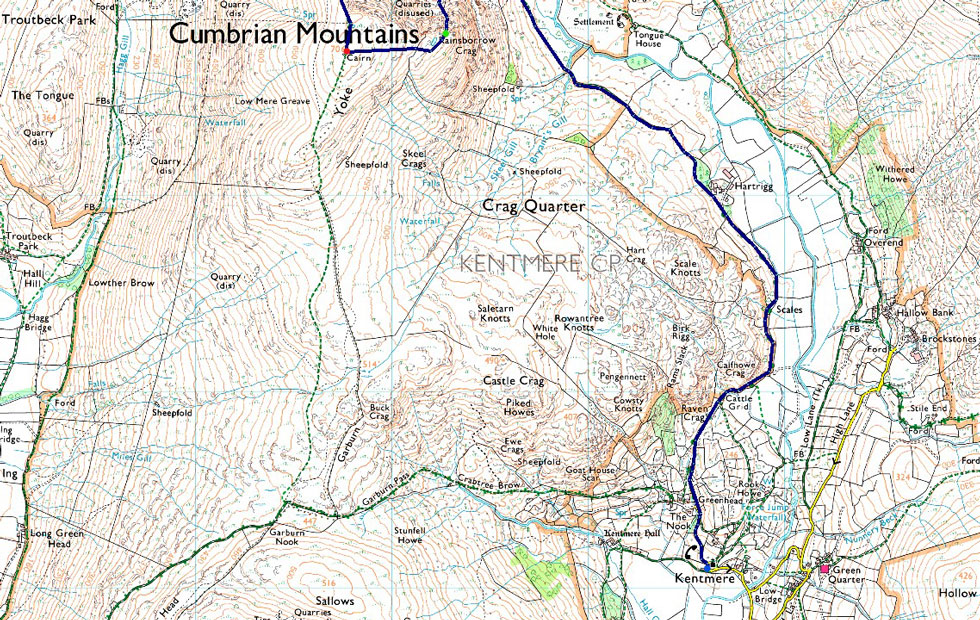 On this side, below the summit is the formidable thousand precipice of Rainsborrow Crag (the safety of which is a subject of disagreement between rock climbers and foxes) and rising above Kentmere village is a knobbly spur that looks like the knuckles of a clenched fist. |
