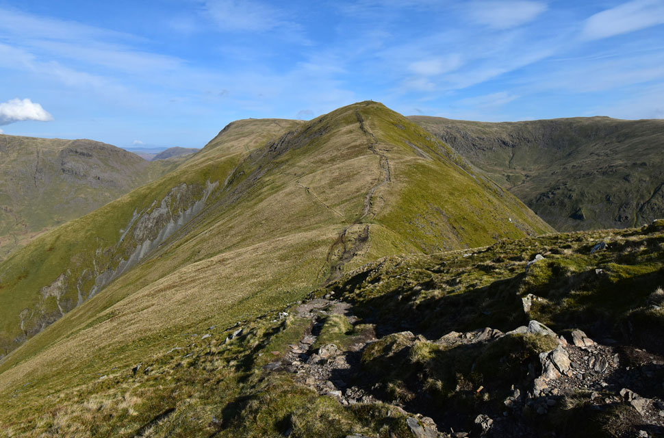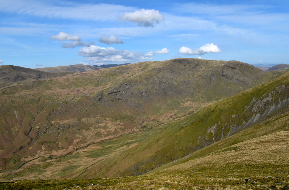 Yoke, III Bell, Froswick (Ill Bell Ridge) Hall Cove and Lingmell End come into view at the head of the Kentmere valley. |