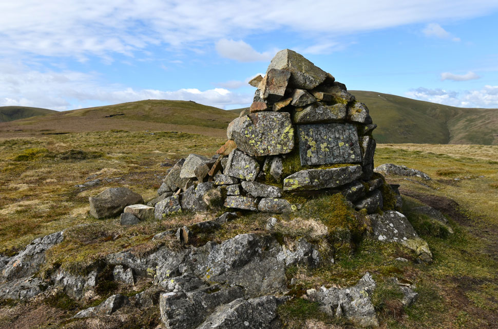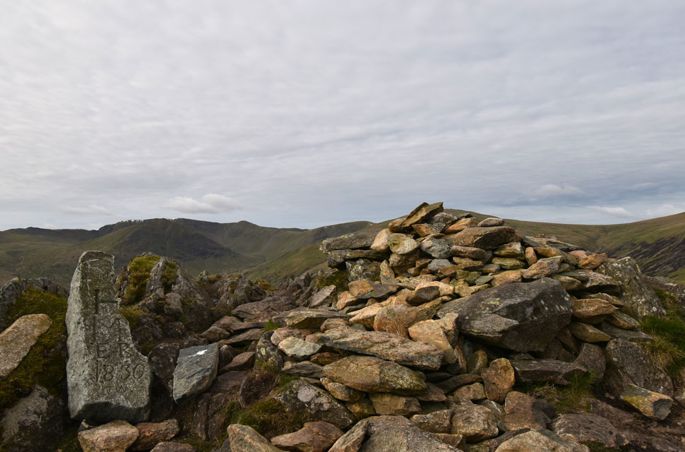 We left Heron Pike and made a direct ascent on Sheffield Pike passing over bog before the summit cairn came into view. To the left is the boundary stone which has been fractured for a least the last three years; suspect cause, freeze-thaw affect, The good news is after all this time the remainder of the stone still resides at the side of the main stone. |