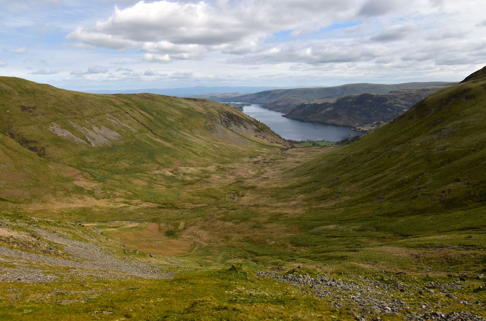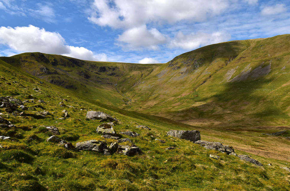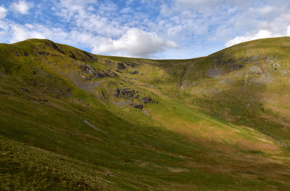 The principle height of this spur is Hart Side, which with its many satellites on the declining ridge forms the southern wall of the long valley of Deepdale throughout its sinuous course, its opposite boundary being the short deep trench of Glencoyne. |