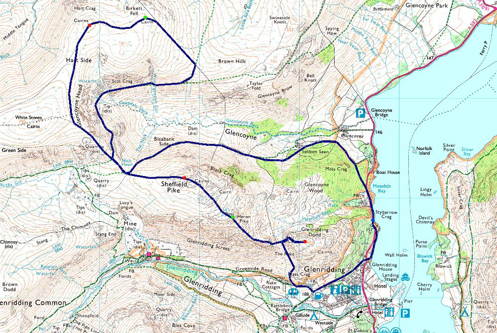 Stybarrow Crag - Ullswater Shore Path - Greenside Road - The Rake - Glenridding Dodd - Heron Pike - Sheffield Pike - Nick Head - Hart Side - Birkett Fell - Glencoyne Traverse - Nick Head - Seldom Seen - Stybarrow Crag |