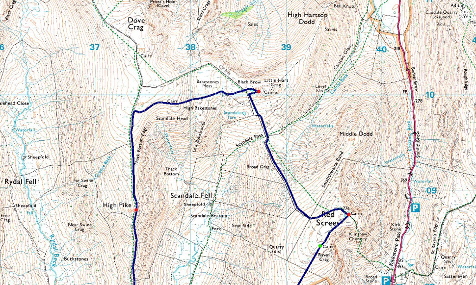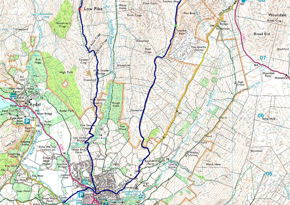 We spoke last week about whether the forecast was good enough in the Lakes that we'd perhaps wild camp here instead, and, as you've guessed, it wasn't, so David came up with the idea of walking the Scandale Round from Amblelside. If you're thinking, "That's a great alternative to the Fairfield Horseshoe," then you'd be exactly right. The Fairfield Horseshoe is of similar mileage and only tops its counter part by about eighty feet in total ascent, plus as we found out today, it's less busier too. |