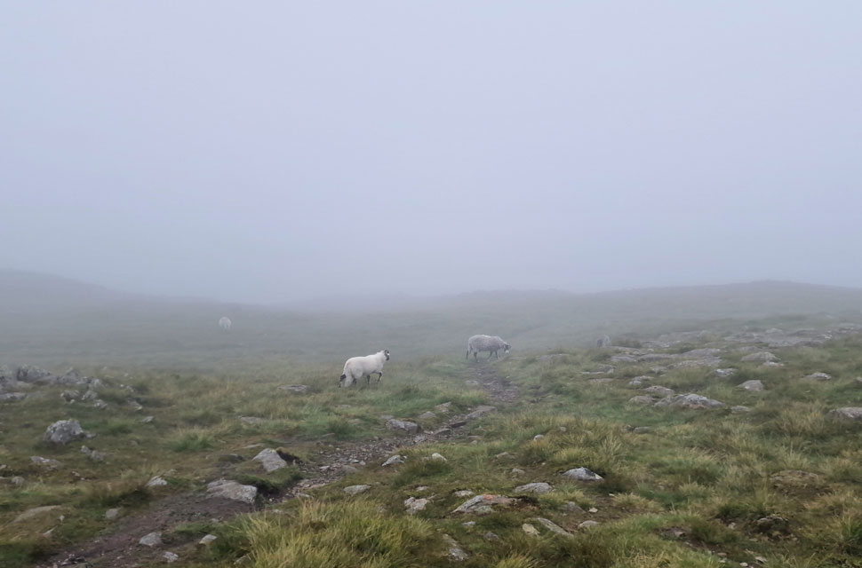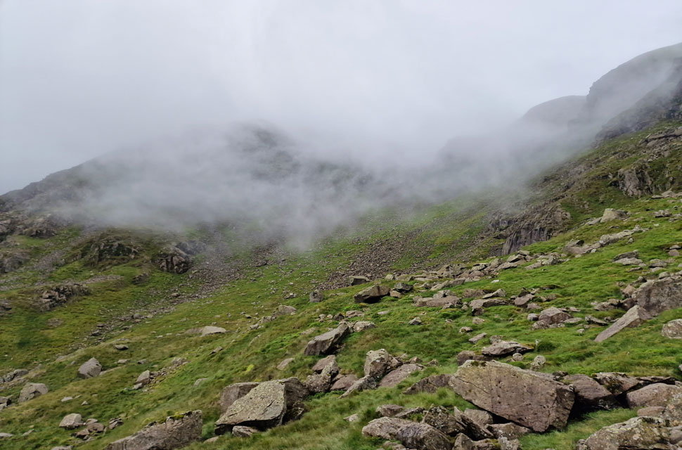 We shouldered Fairfield as the mist clung to layers, hair included. Through the cloud, we heard voices and then silence until we spotted two fell runners topping out on Cofa Pike. The outlines of their bodies barely visible as we continued over the shoulder, sighting the familiar cairns that led us towards the summit shelter. The wind had dropped but there was no let-up with the mist, which had turned into rain. We continued towards Link Hause, passing the head of the gully we so nearly ascended by. From out of the cloud, a chap and a black labrador appeared, one hand glued to his phone and the other holding the pooches lead. He veered sharply towards us without summiting and passed with a 'morning' shortly followed by the two fell runners we'd seen on Cofa Pike minutes earlier. |