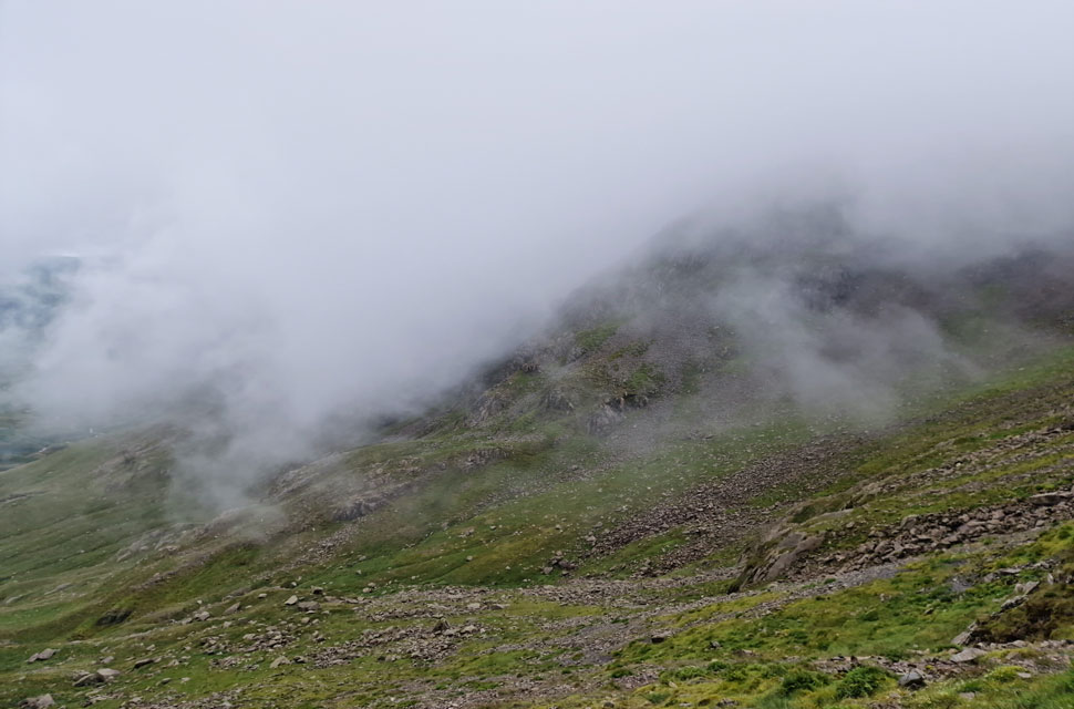 The cloud thickened and continued to pour into the cove until it stretched across the entire width of Deepdale. With the cloud came drizzle. Non of us expecting either! |