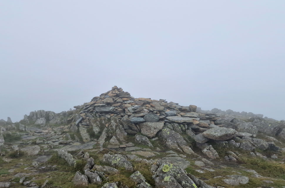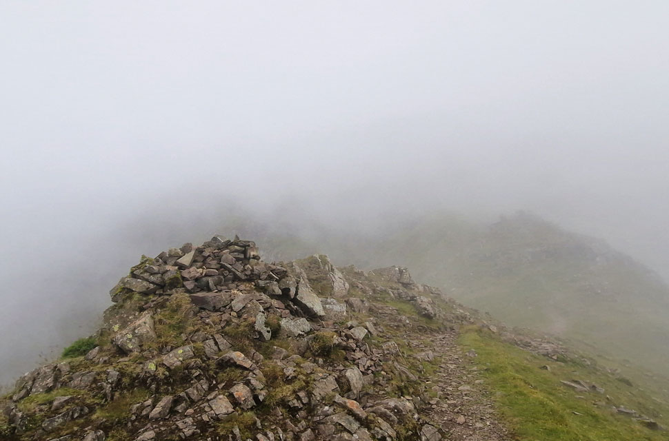 The mist and cloud was relentless as we crossed Link Hause, visibility down to the end of our toe caps while others just the outline of rock in the near distance. Cold now, my fingers & hands crying out for a pair of gloves which I obliged them by. Our path began to descend both of us never fearing our position as we left Link Hause behind for the short but steady ascent on Hart Crag. Over to our right the secondary summit cairn; in conditions as we had could have easily been mistaken for the main summit which we knew was just a few feet away to the south, sure enough after rock hopping between the two cairns the summit appeared. |