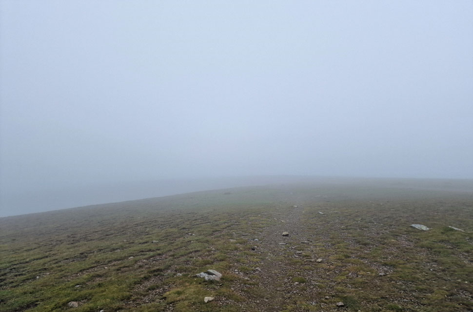 We track east and pick up the path which will descend us steeply from the summit both hoping that we'd also drop out of the cloud. |