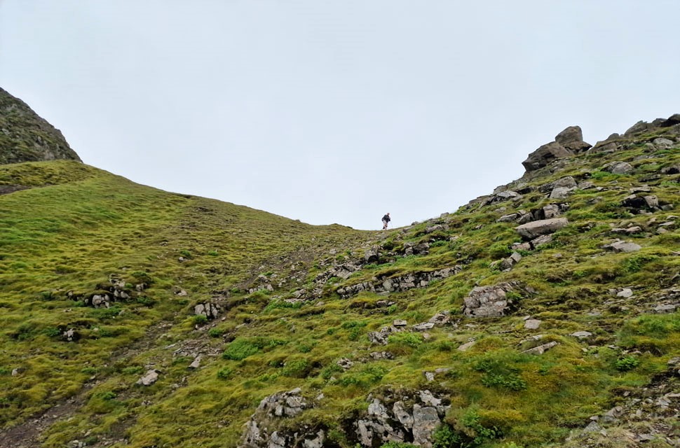 By now the sun had briefly come out, and we were basking in warm sunshine tempered by cool mountain air. From the Sheepfold, we still had the option to head right for Deepdale Hause, but we decided to ascend around 500 feet of steep grassy tongue and evaluate an ascent via Flinty Grave from its top. After crossing the origins of Deepdale Beck after the Sheepfold, we began the steep ascent of the tongue, each forward step, feeling like we were wading in and out of deep snow, such the boggy grass underfoot which absorbed water like a sponge.