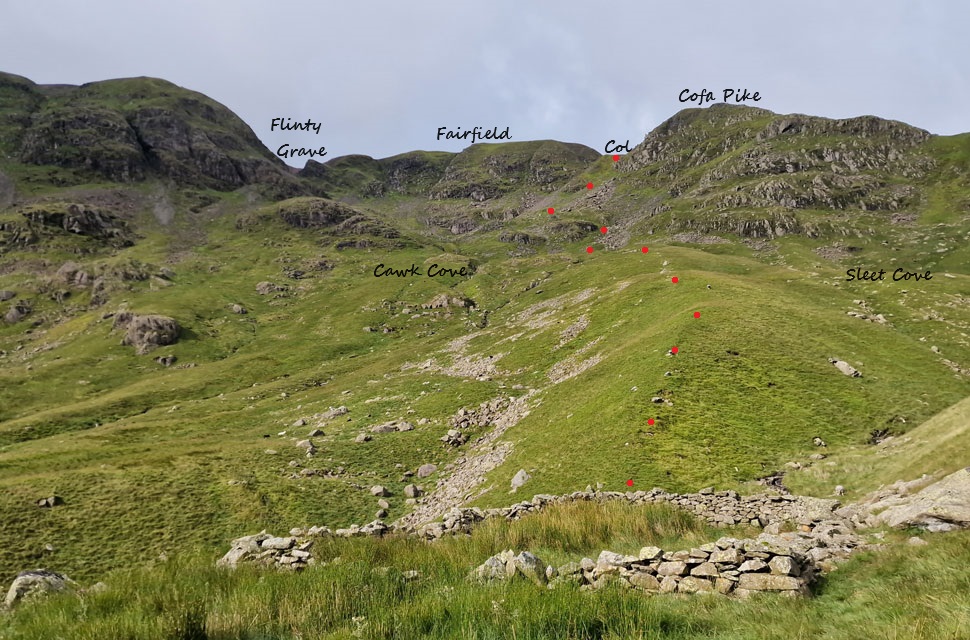 It was hard work to reach the top of the tongue from where we made our decision. The option to ascend via Flinty Grave looked as advertising as its name sake suggests, the area being made up of steep loose scree. During our ascent of the tongue, we were weighing up other possible ascents. I spotted two shelf routes on Cofa Pike, but on closer inspection, these were buttressed by steep rock. David suggested gaining the col linking Fairfield with Cofa Pike, a narrow ridge around 250 feet in length. After agreeing an ascent by eye, we went for it. |