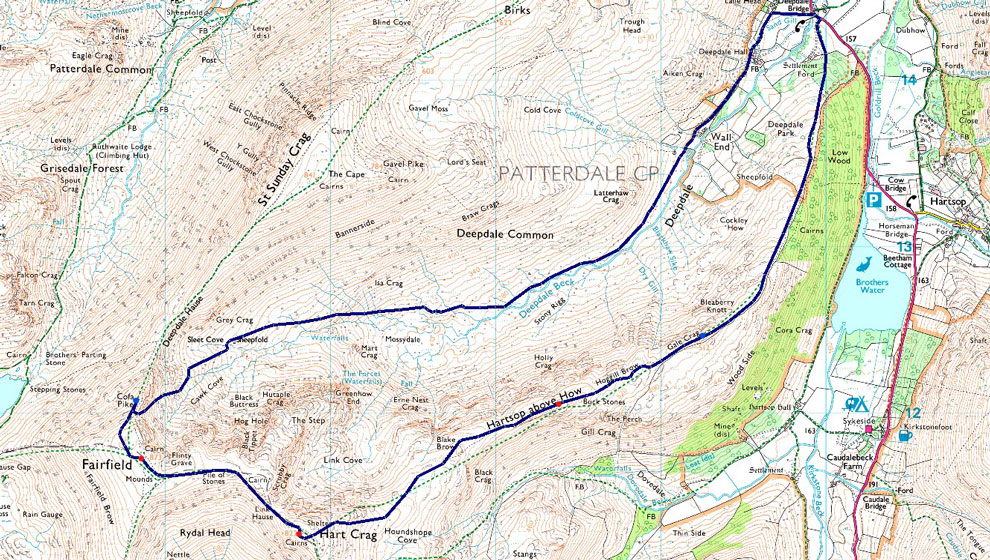 Deepdale Bridge - Deepdale Hall - Wall End - Deepdale - Deepdale Beck - Mossydale - Cawk Cove - Cofa Pike - Fairfield - Link Hause - Hart Crag - Hartsop above How - Gale Crag - Deepdale Bridge |
