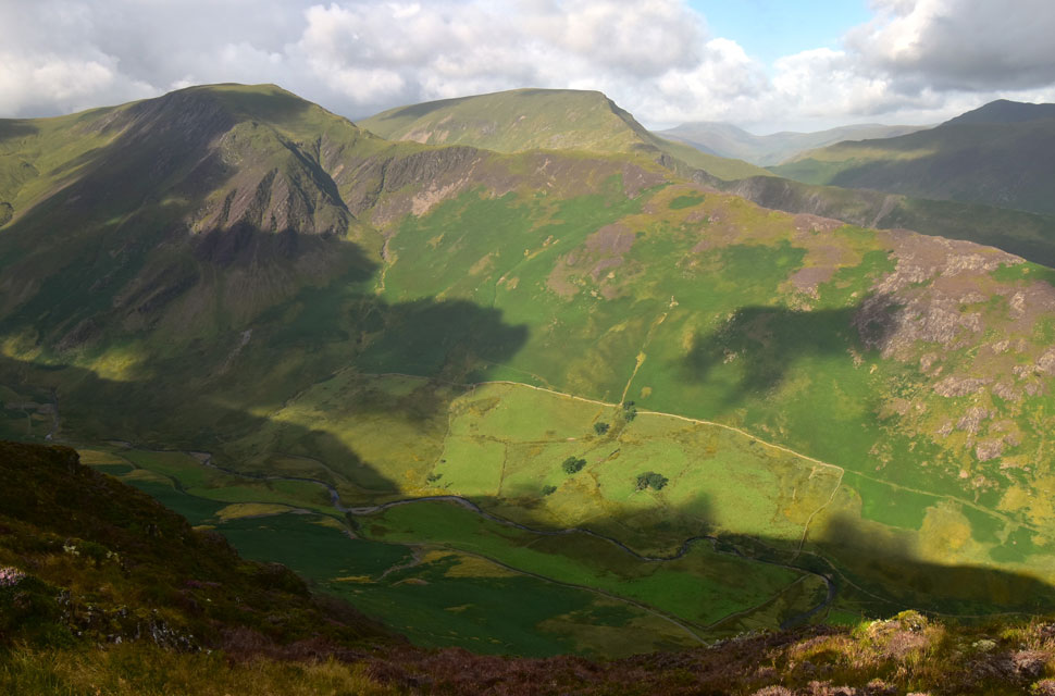 Views over Newlands Beck towards Squatt Knotts on Hindscarth with Robinson in the distance. |