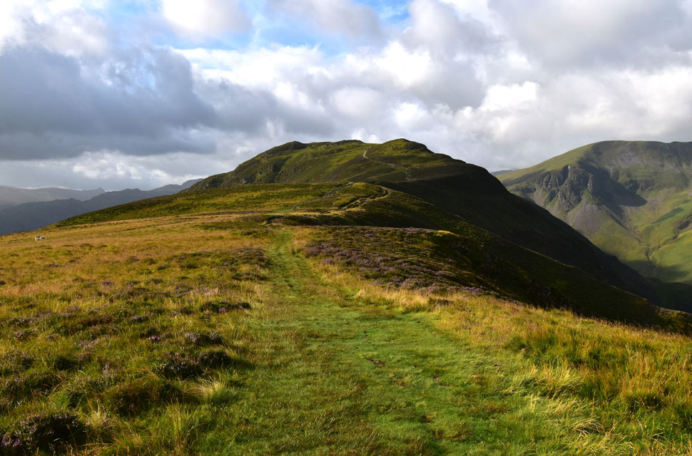 The path descends to the left of Cockley How before crossing Swanesty How on the outskirts of Grange below. |