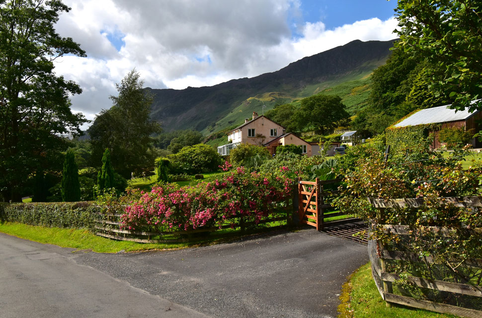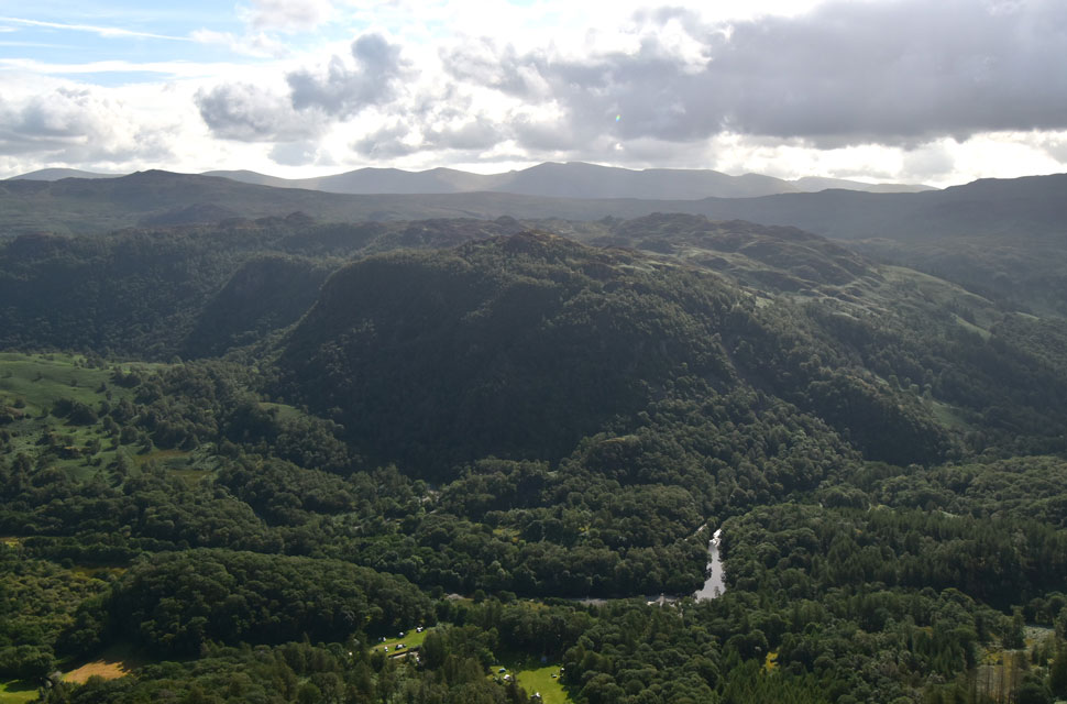 Views over Hollows Farm campsite towards the tree rich Kings How and Grange Fell. |