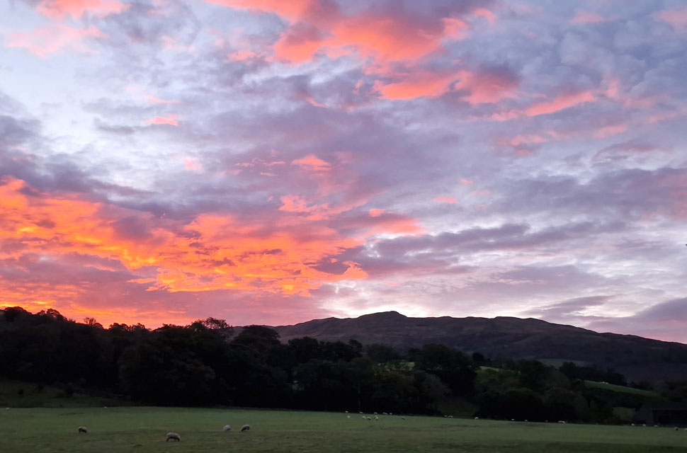 Fiery sunrise over Wansfell Pike. |