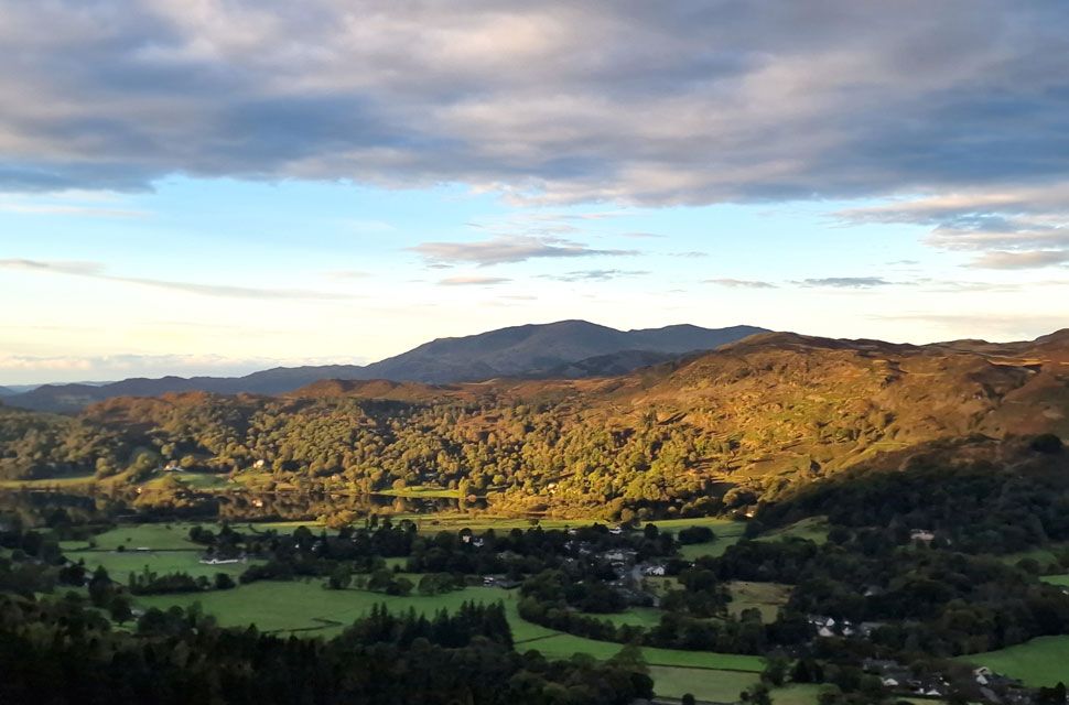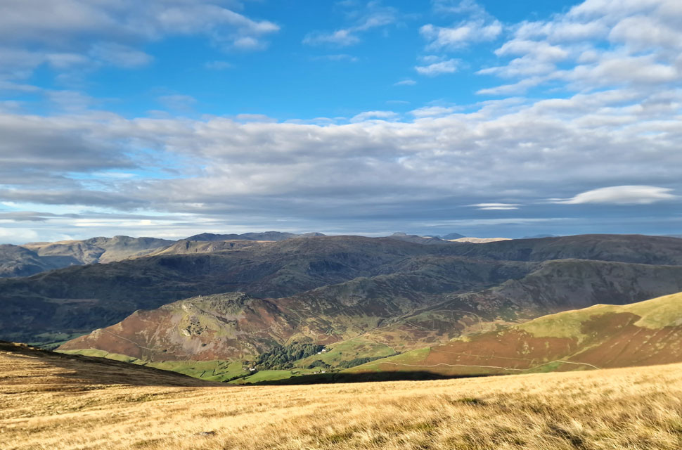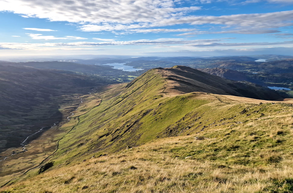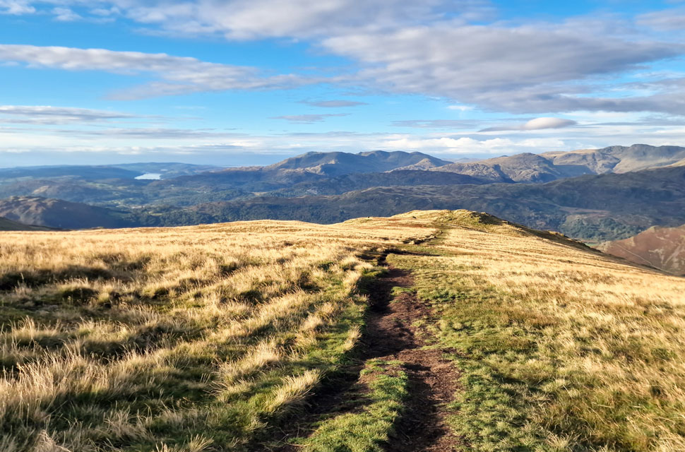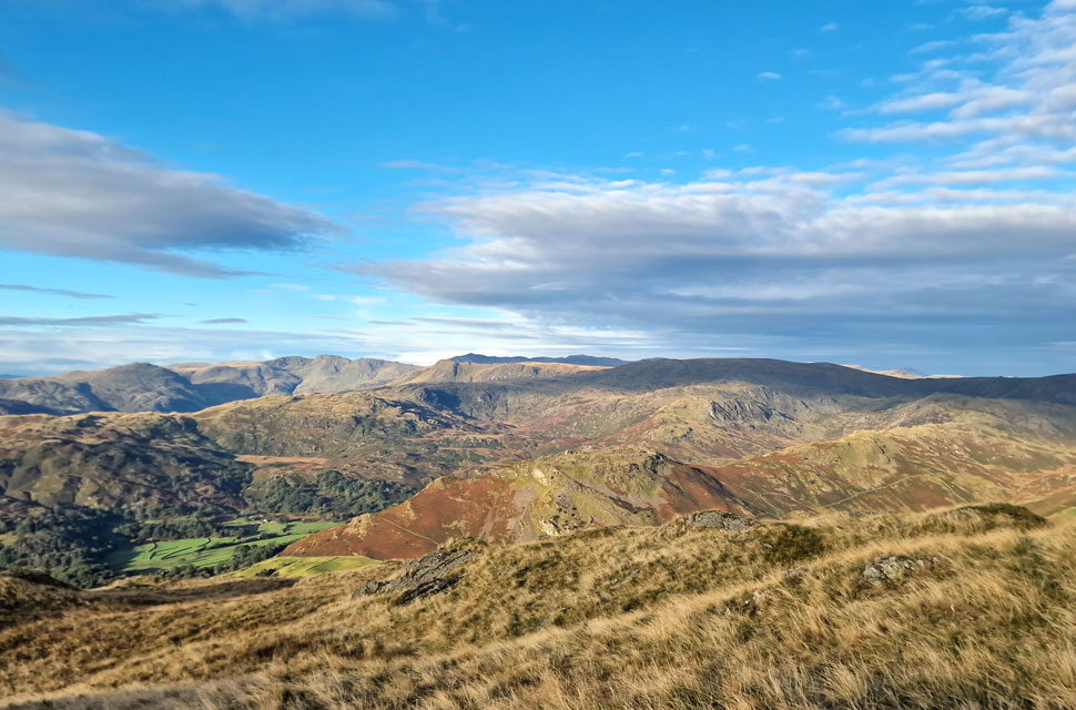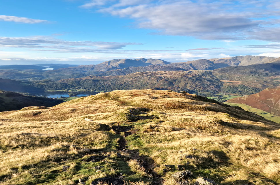 Looking back on Rydal Fell, Heron Pike and Nab Scar and a distant Windermere. |