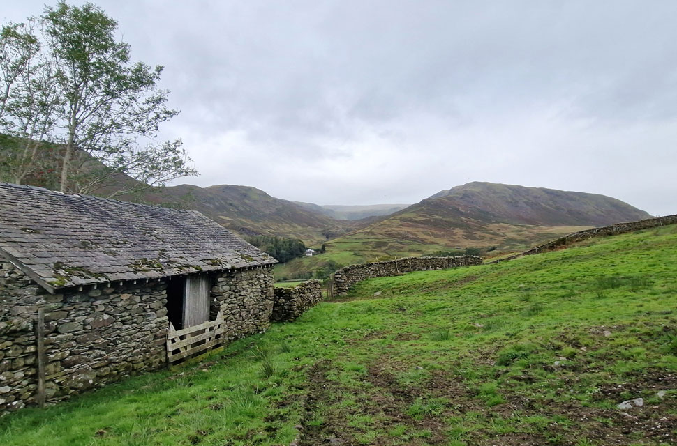 My hands and ears had warmed up now as I continued my descent accompanied by the sound of Tongue Gill cascading through the valley. I was soon passed by half a dozen mountain bikers riding E-bikes; some of these were high-end Whyte, Santa Cruz, and Pivot bikes worth north of 6k. I'm really fond of this path, and I always feel the experience is over too soon once the two wooden footbridges over Tongue Gill are reached, one to pass over the gill and the second to cross the Ford. I pass over the first bridge and swill my boots out in the Ford before passing through the gate, my path flanked by dying bracken on both sides. Views open out from an old stone building across a muddied field towards Steel Fell and the Greenburn valley where I crossed my arms across the top of a wooden gate staring blankly through the rain drifting into deep thought. The view made me realise that even after all these years Lakeland hasn't changed that much, just the people in it. |