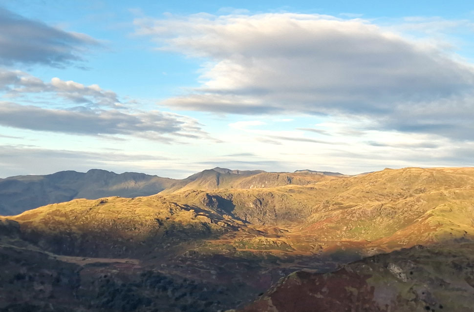 With Crinkle Crags, Bow Fell and the Scafells in the distance seen from Stone Arthur summit. |