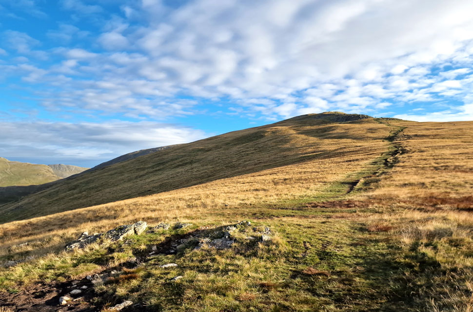Fairfield ahead with Dollywaggon Pike. Nethermost Pike and Helvellyn seen to the left. |