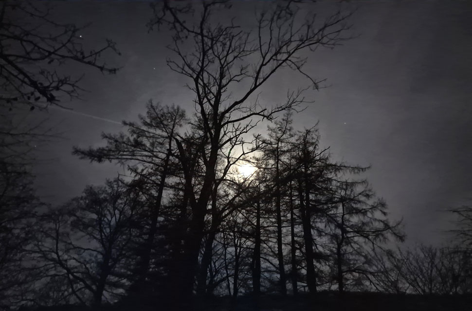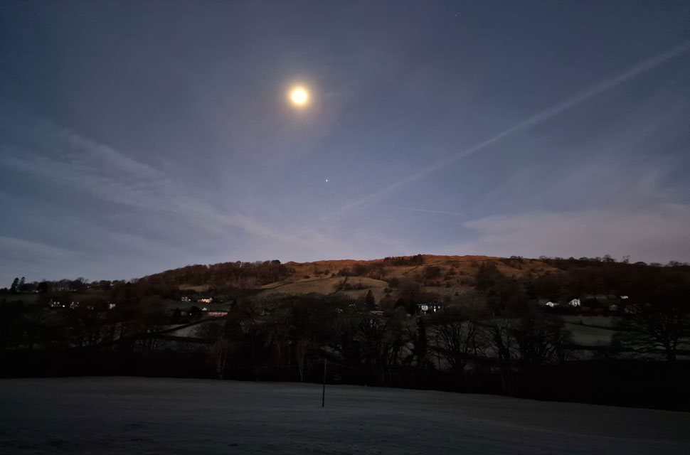 | We crossed the wooden footbridge over Trout Beck noting that a layer of frost coated the wooden boards making them slippery so I hovered my hands over the rails just in case I lost my footing. It was still pitch black but an almost full moon lit the way until we reached the bottom of the pass. Here we stopped to look towards the dimly lit cottages of Troutbeck and Skelghyll Woods. |