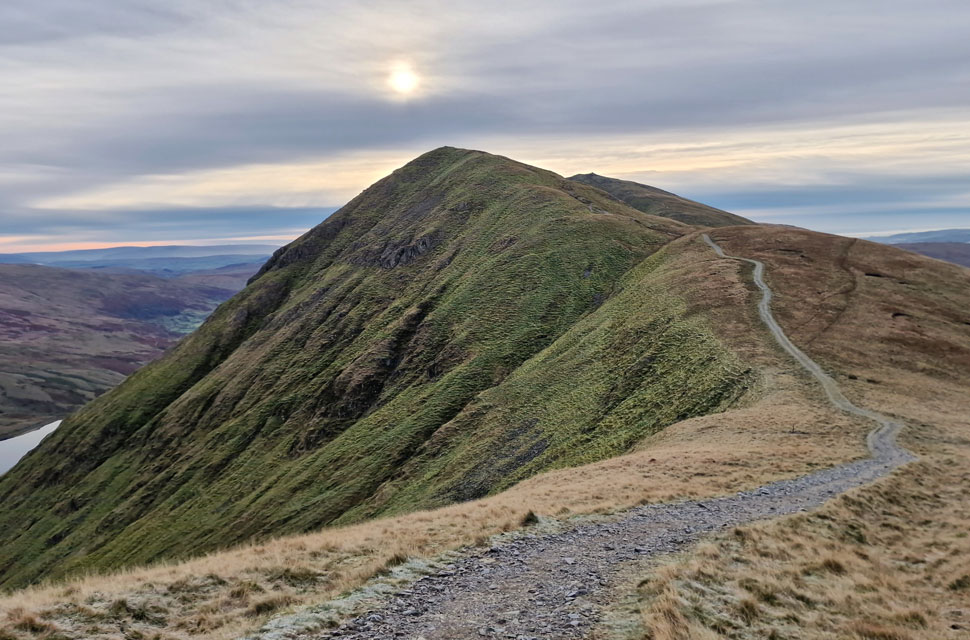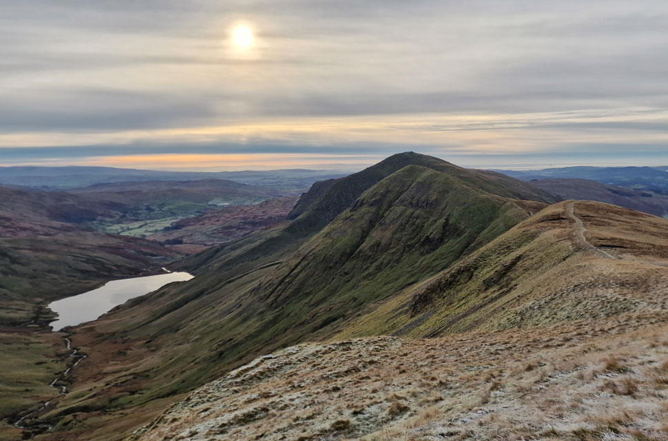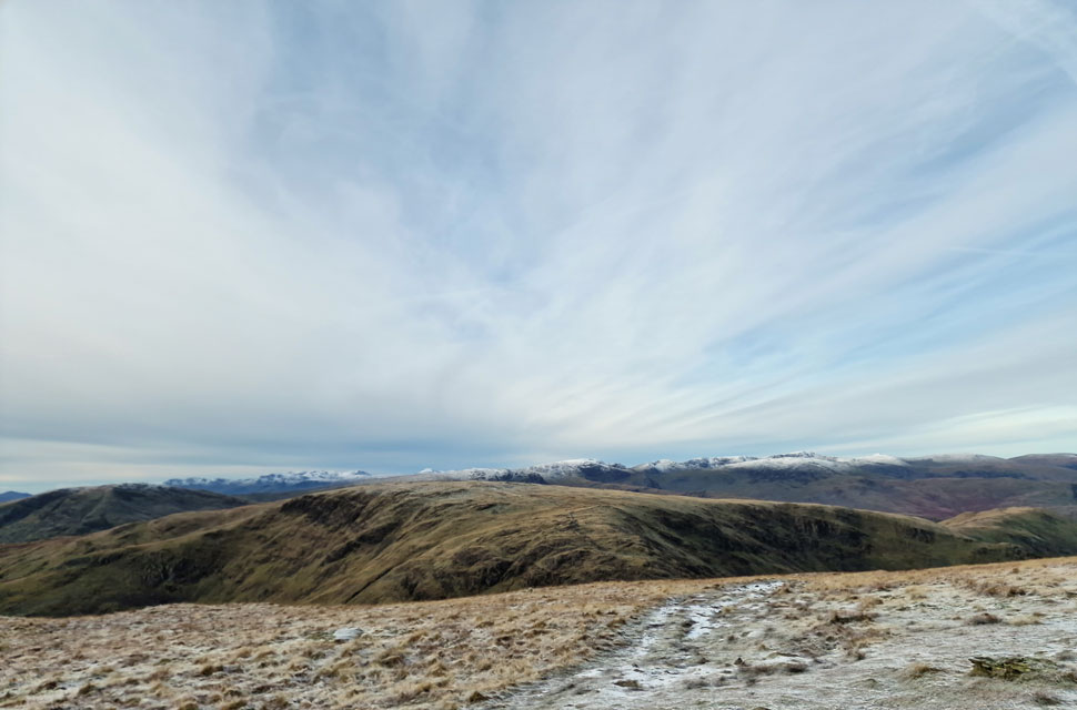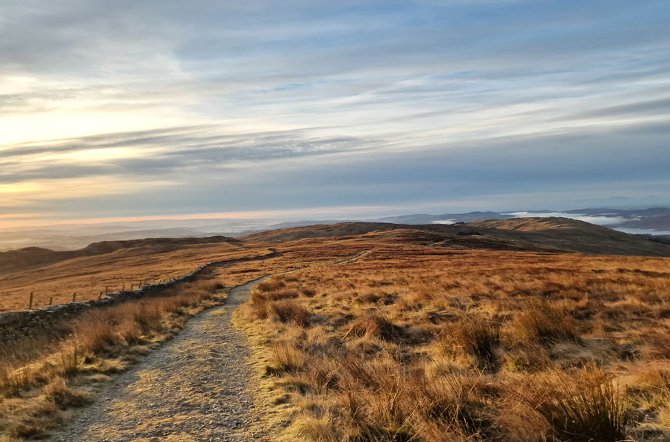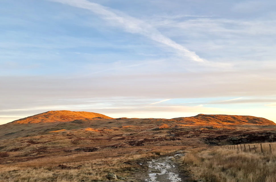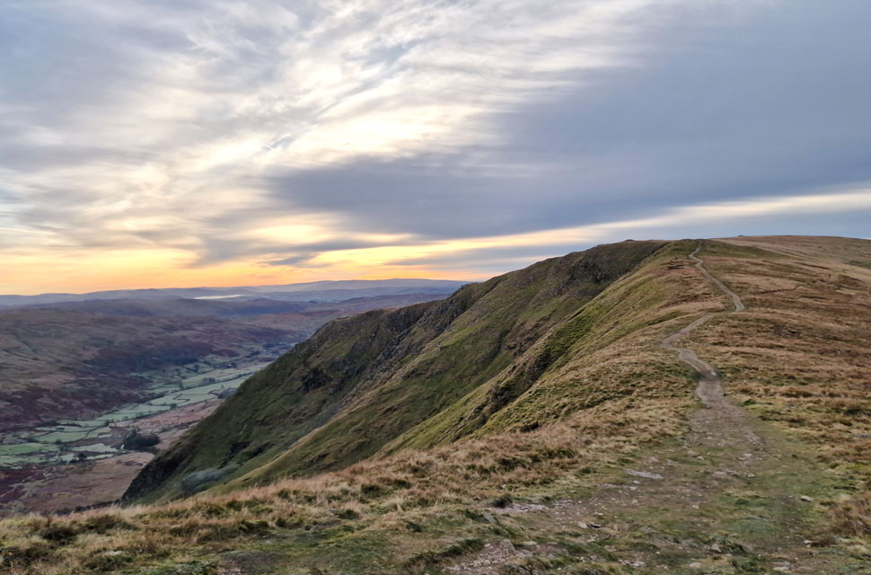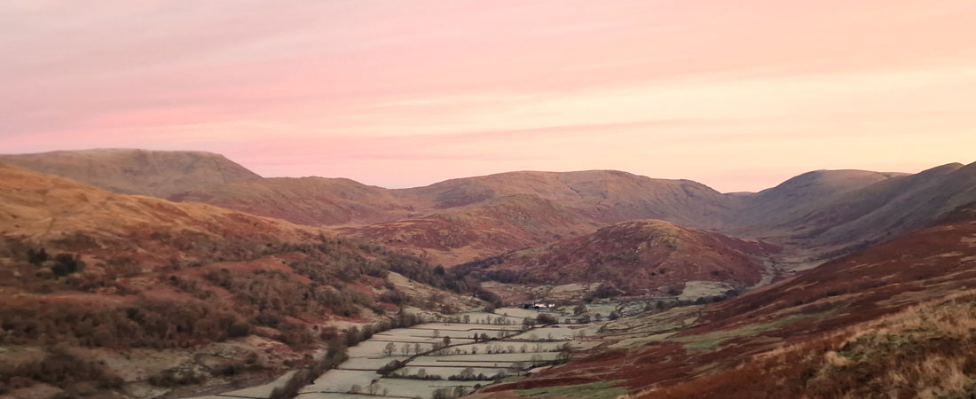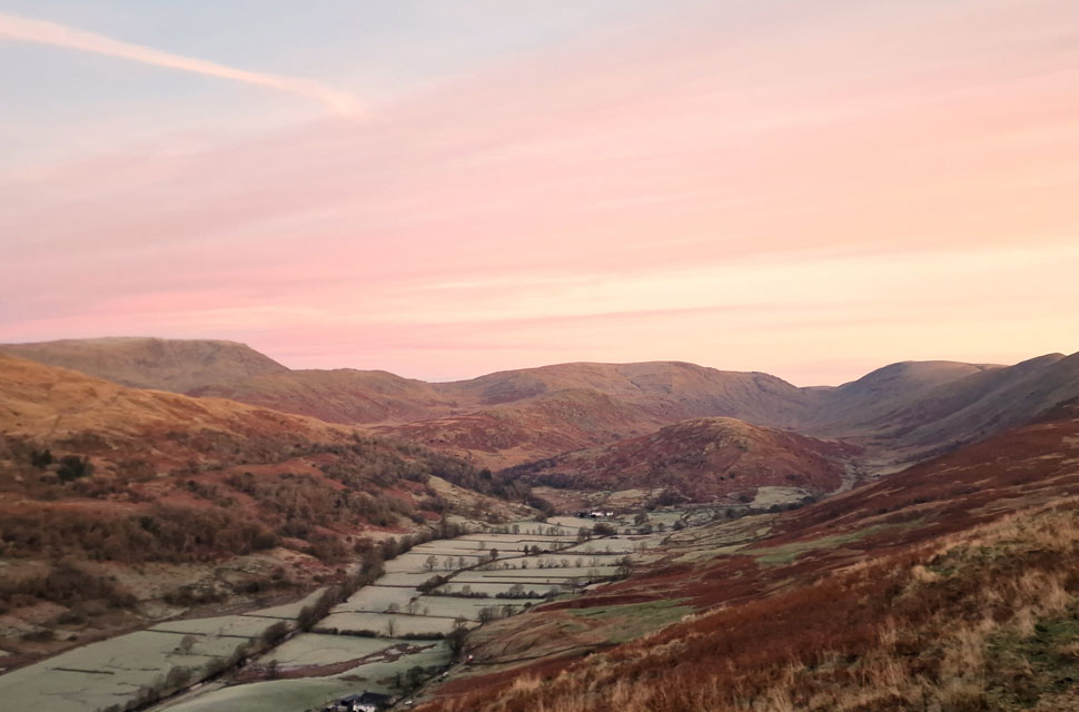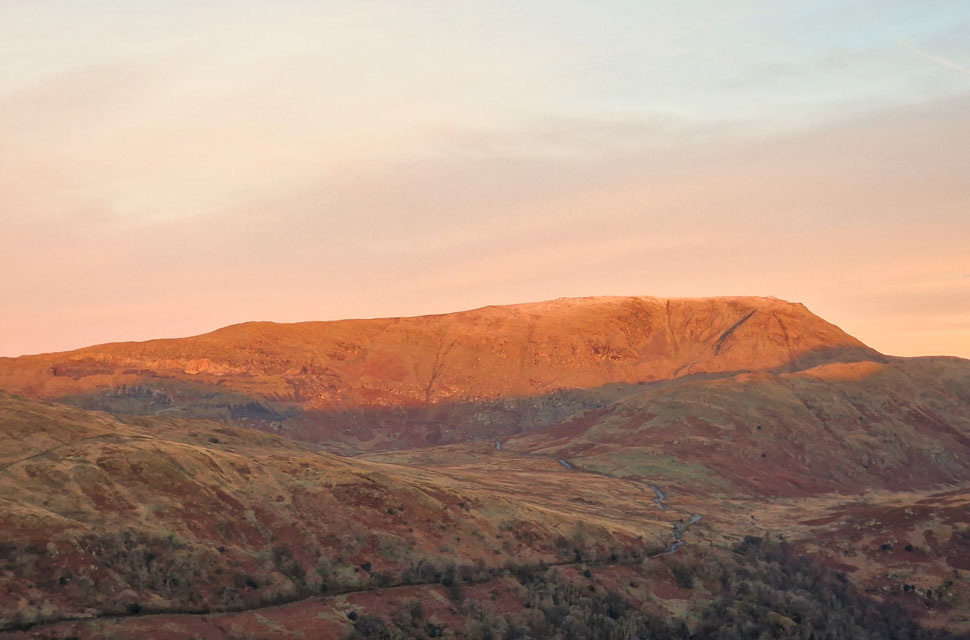 | We continued up the track not quite believing the view as the sunrise took hold casting a pink hue over Red Screes stretching south as far as Wansfell Pike. |