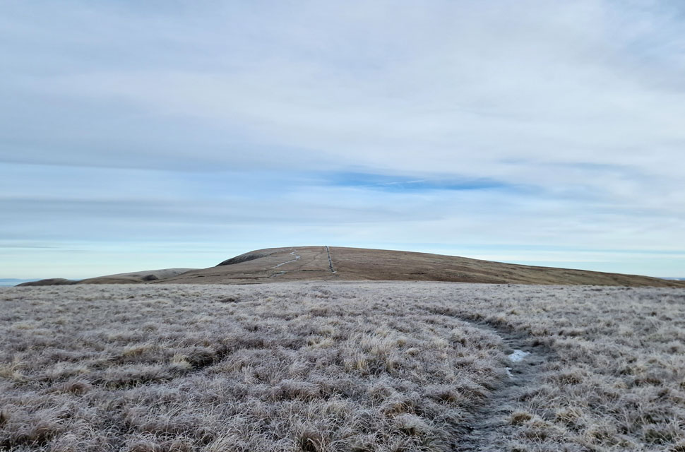 | We left the path as planned picking up a frozen grassy trod that led us towards the summit shoulder ascending by the right of the wall before doubling back by the left. |