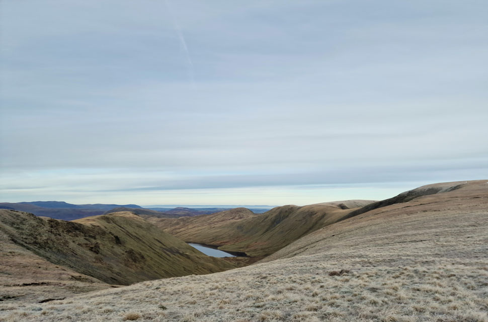 | Looking down on Kentmere Reservoir and The III Bell Ridge. |