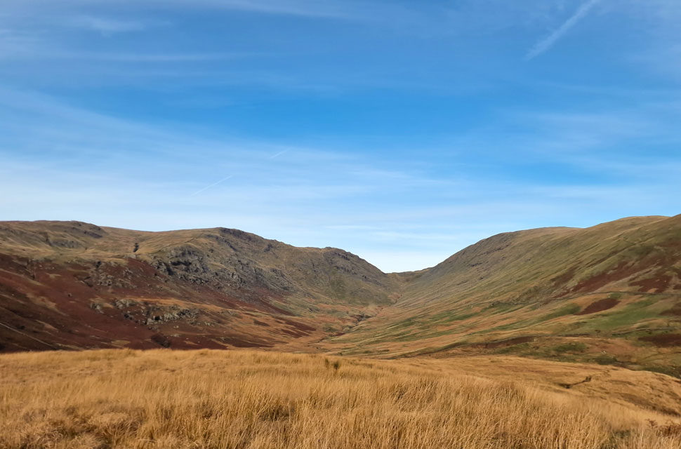 | Looking into the jaws of Thresthwaite Mouth with Stony Cove Pike and Caudale Moor (left) and Thornthwaite Crag (right) |