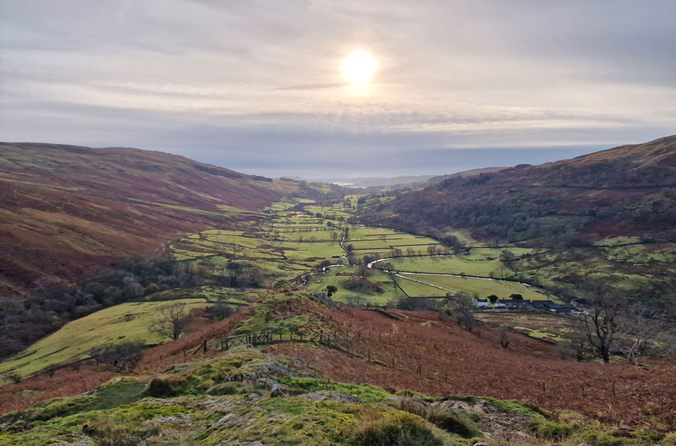 We dropped into the valley watching the last of the sunlight reflect off Trout Beck below as it snaked through the valley. Windermere disappeared behind the tree line when we passed a couple, no doubt heading for Troutbeck Tongue, only the third walkers we'd seen in nearly seven hours. We reached the valley floor proper and joined Ing Lane, where we passed another couple and their Dalamation who looked quizically through a gate towards sheep in a nearby field. It was comical to see the dogs reaction who might as well have been looking at aliens such the expression across its face. We were on the march back to Church Bridge, both recalling the many highs of the day and agreeing that setting off under darkness was high up there, and we agreed we'd planned to do it again. With Ing Lane behind us, I took one last look back at the III Bell Ridge, which looked as menacing as previously, but this was overlooked by the sound of the rut from the steep slopes below III Bell. We scoured the fellside but couldn't spot the deer. We left Ing Lane for Truss Lane, from where we could hear the traffic on the A592 travelling above our heads.