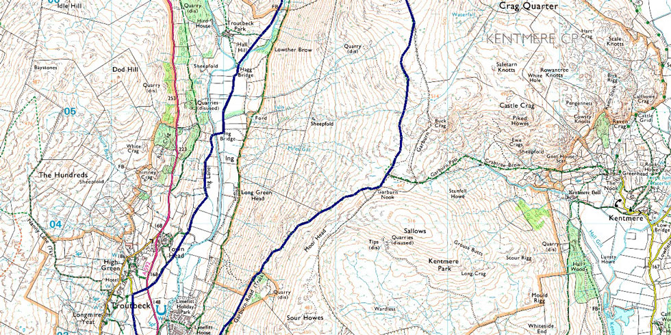 Church Bridge - Garburn Pass - Top of Garburn Pass - Yoke - III Bell - Froswick - High Street - Thornthwaite Crag - Scott's Rake - Hagg Gill - Troutbeck Tongue - Hagg Bridge - Ing Bridge - Ing Lane - Truss Lane - A592 - Troutbeck - Jesus Church - Church Bridge |